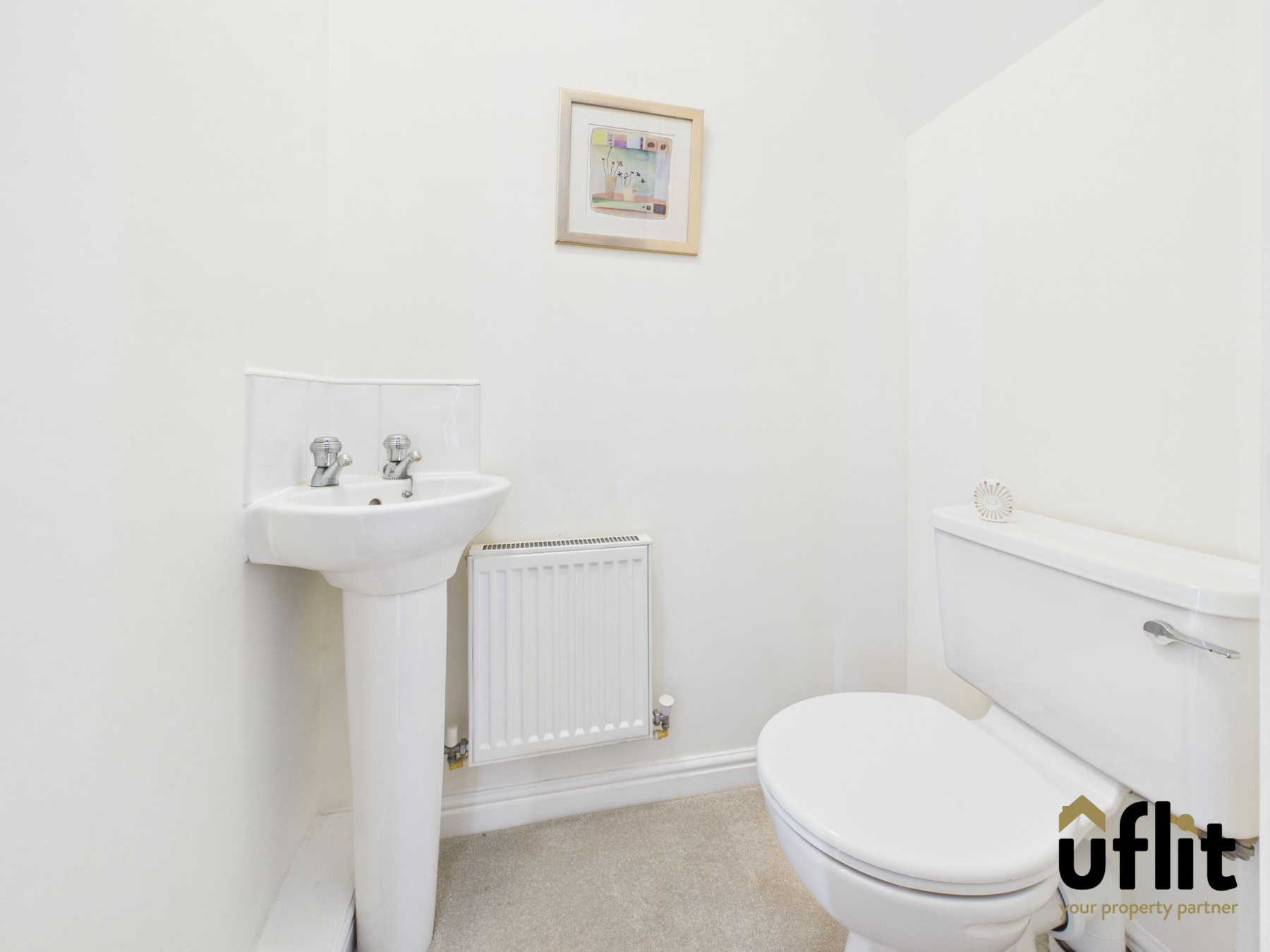 The downstairs WC is fitted with a low-level WC and wash basin, finished with partial tiling and carpeted flooring, offering a convenient facility for guests and everyday family use.