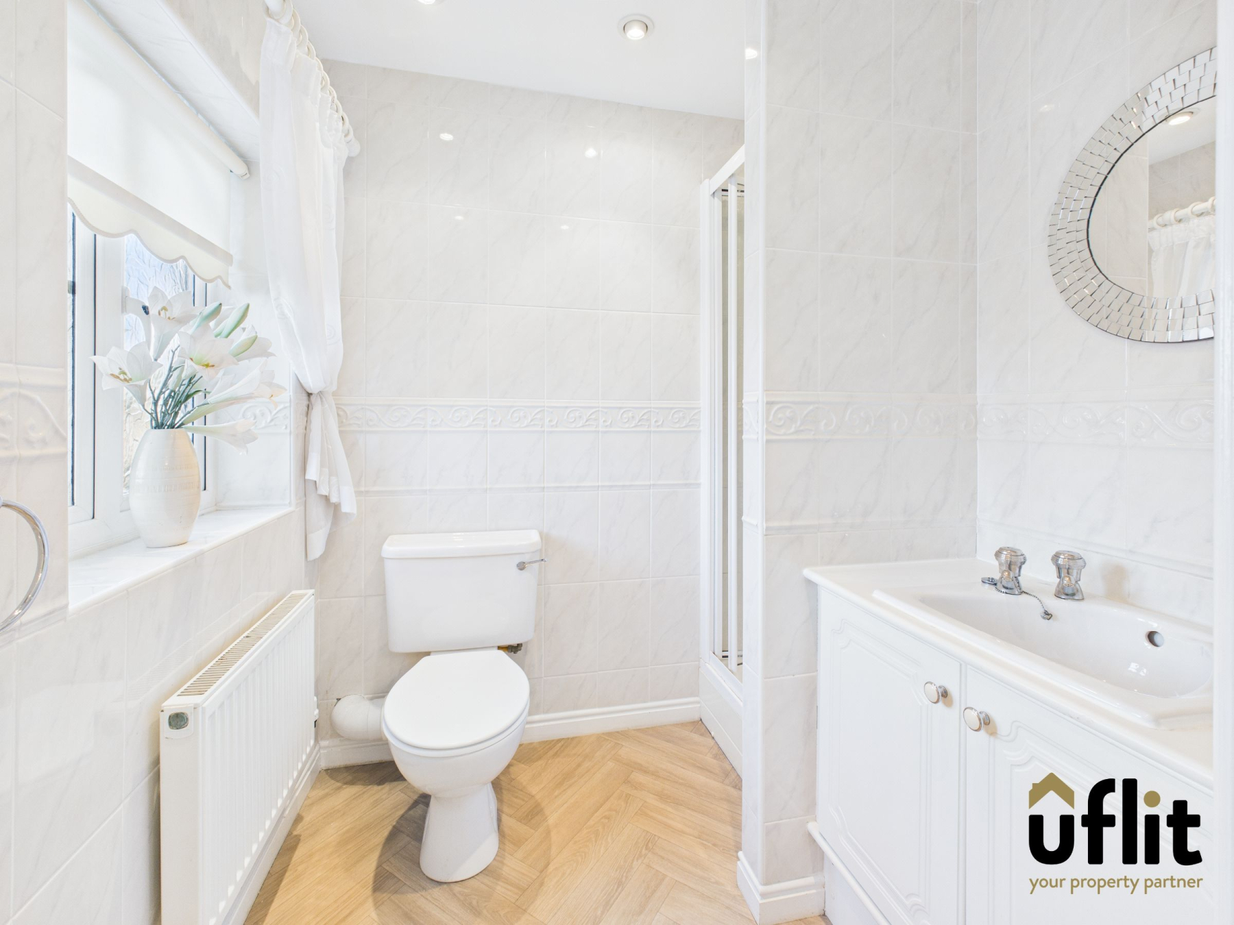 The family bathroom is fitted with a modern white suite and is fully tiled throughout. Finished with laminate flooring, the room also benefits from a wash basin, radiator, spotlights and a window providing natural light.