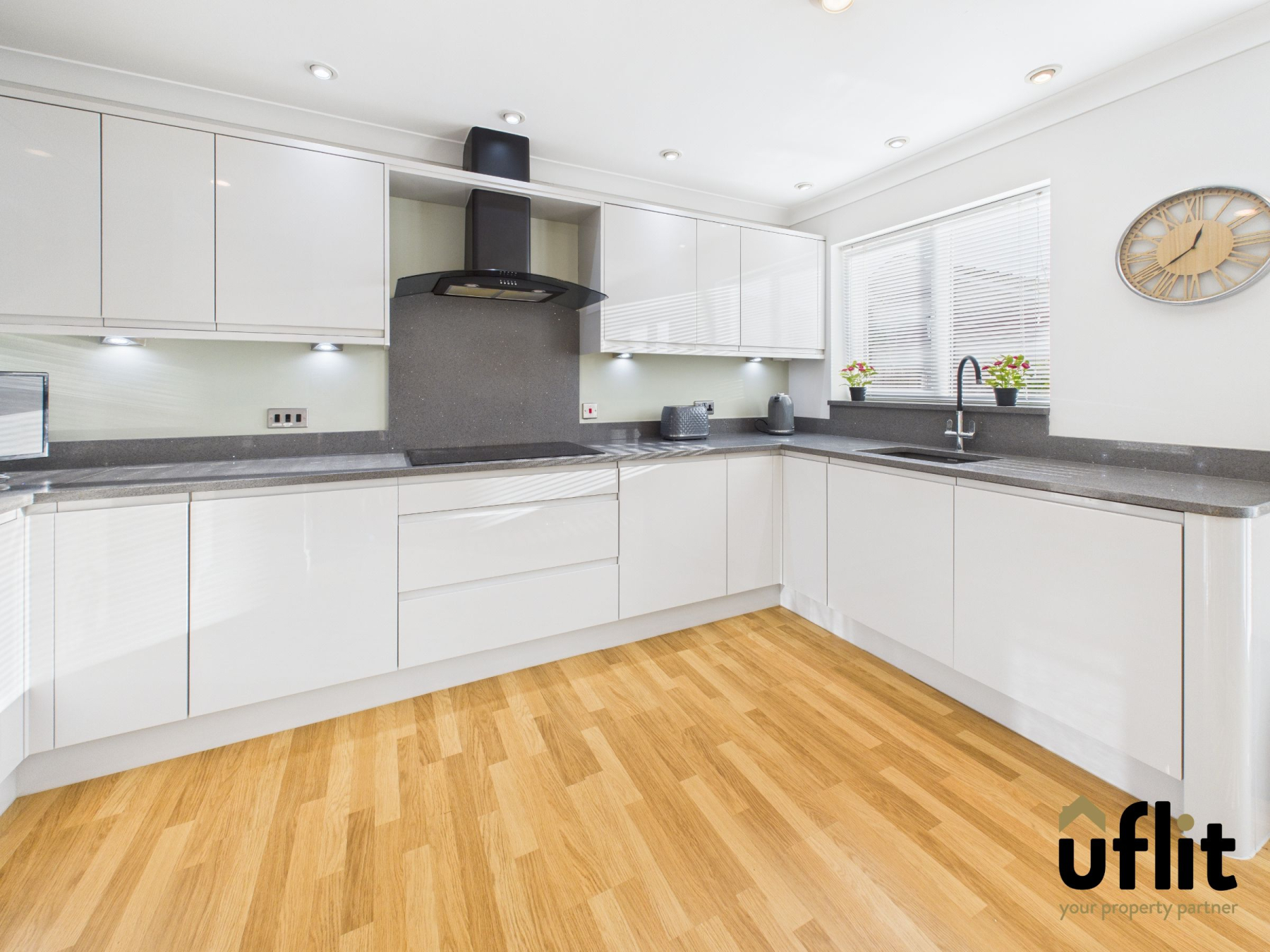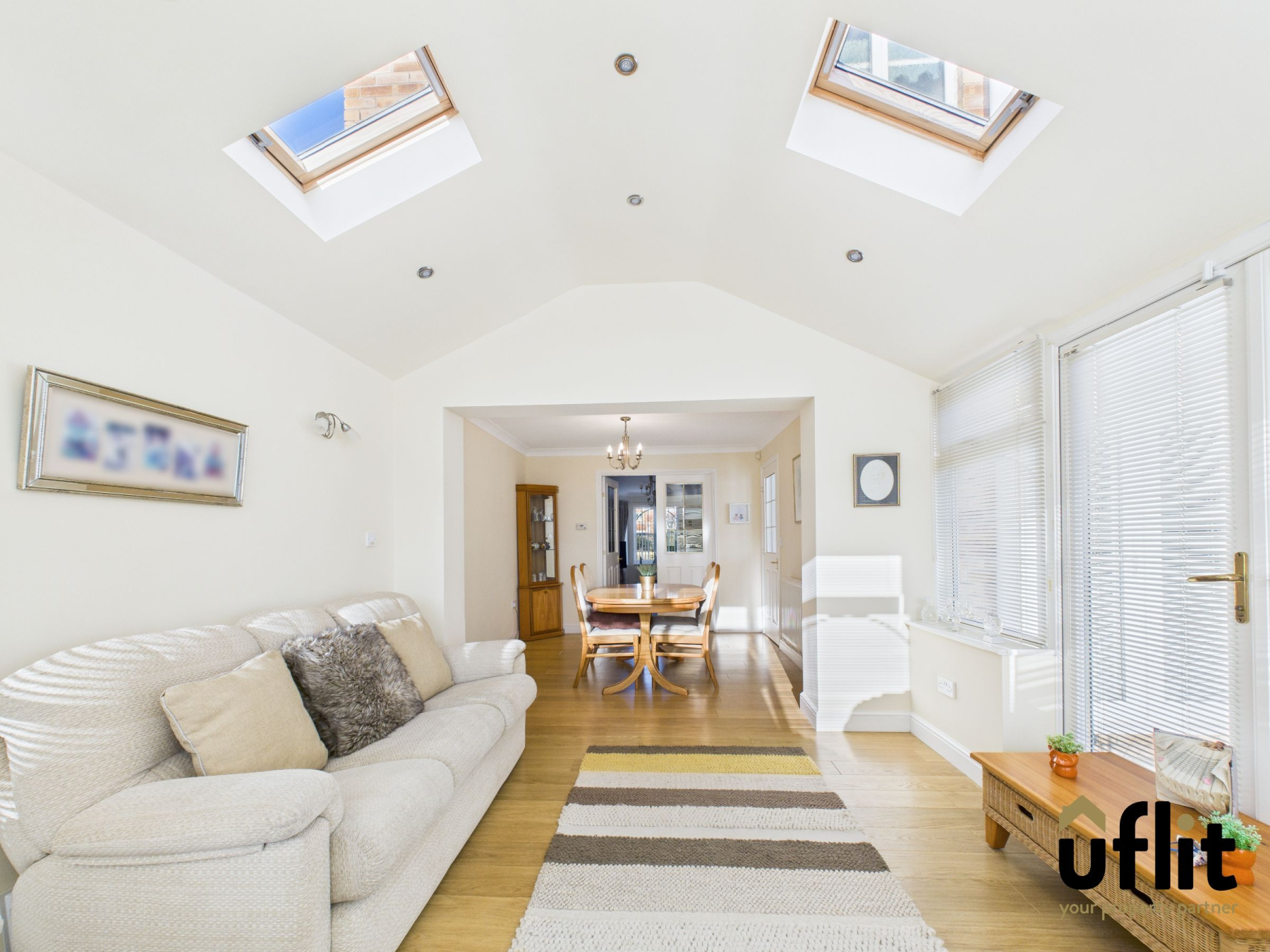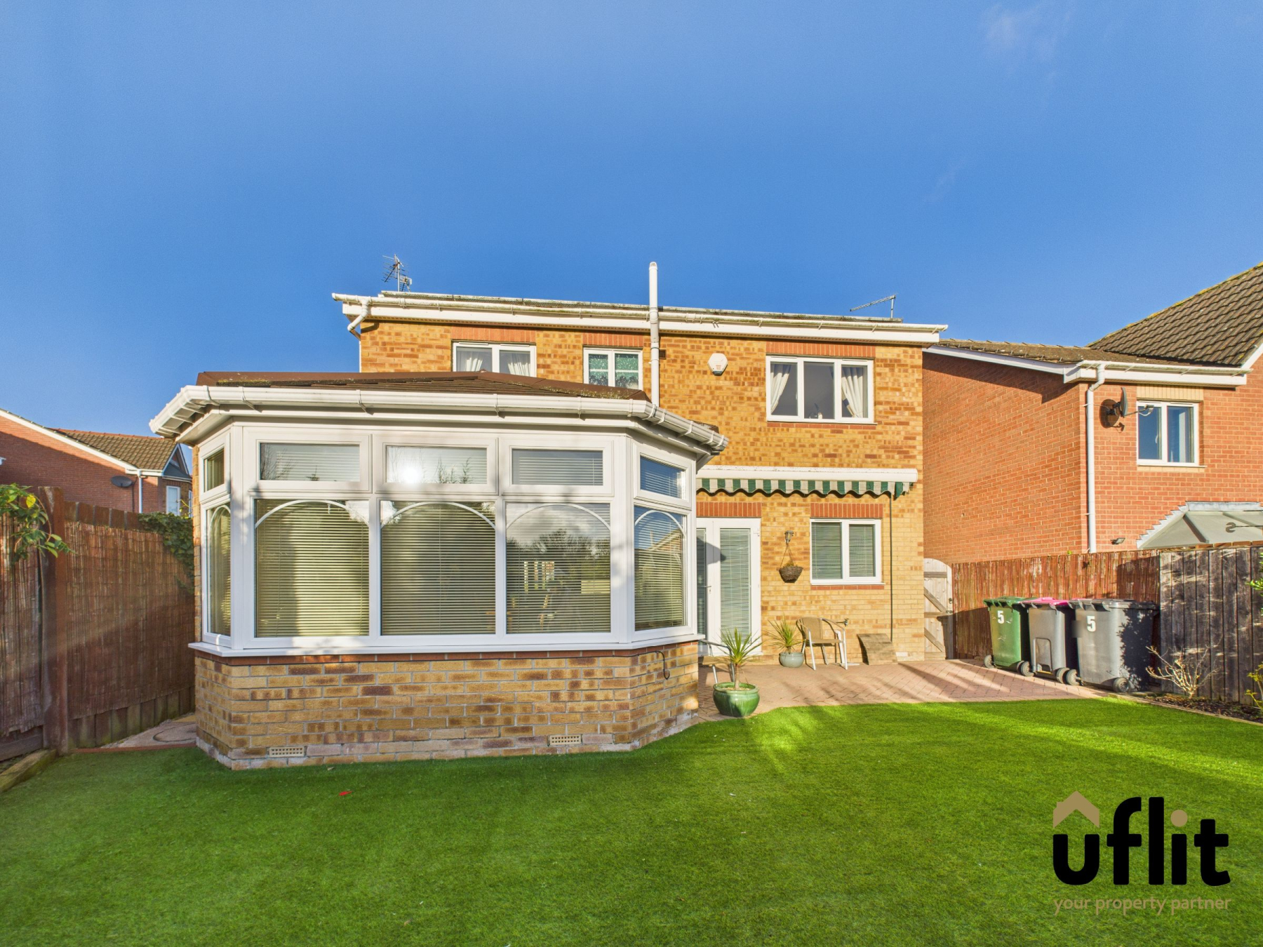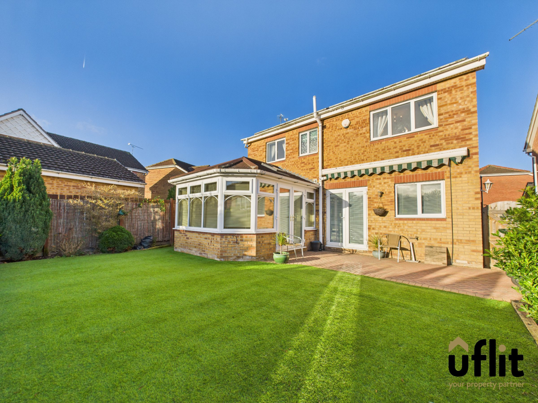 Uflit are delighted to bring to the market this stunning, spacious executive four-bedroom detached property. Set within a quiet and desirable residential area, the home offers generous living accommodation, modern finishes throughout and a warm, welcoming layout that is perfectly suited to family life, combining comfort, style and practicality. Approached via a private driveway, the property enjoys a neat frontage with a side lawn finished in low-maintenance artificial grass, creating an attractive first impression before you even step inside. The property is entered via a white UPVC porch door into a bright porch area with laminate flooring, leading through to a white wooden front door. Inside, the carpeted hallway creates a warm welcome and a carpeted staircase with white spindles rising to the first floor. The lounge is a spacious and elegant room with a bay window, allowing plenty of natural light featuring a marble fire surround with electric fire. Double glazed doors open into the dining snug, creating an ideal space for entertaining or relaxed family living. The modern kitchen diner features sleek units and quartz worktops with integrated appliances and French doors opening onto the garden. The adjoining dining snug flows into an extended conservatory with an all-year-round roof, creating a versatile and inviting additional living space. A downstairs WC completes the ground floor.
