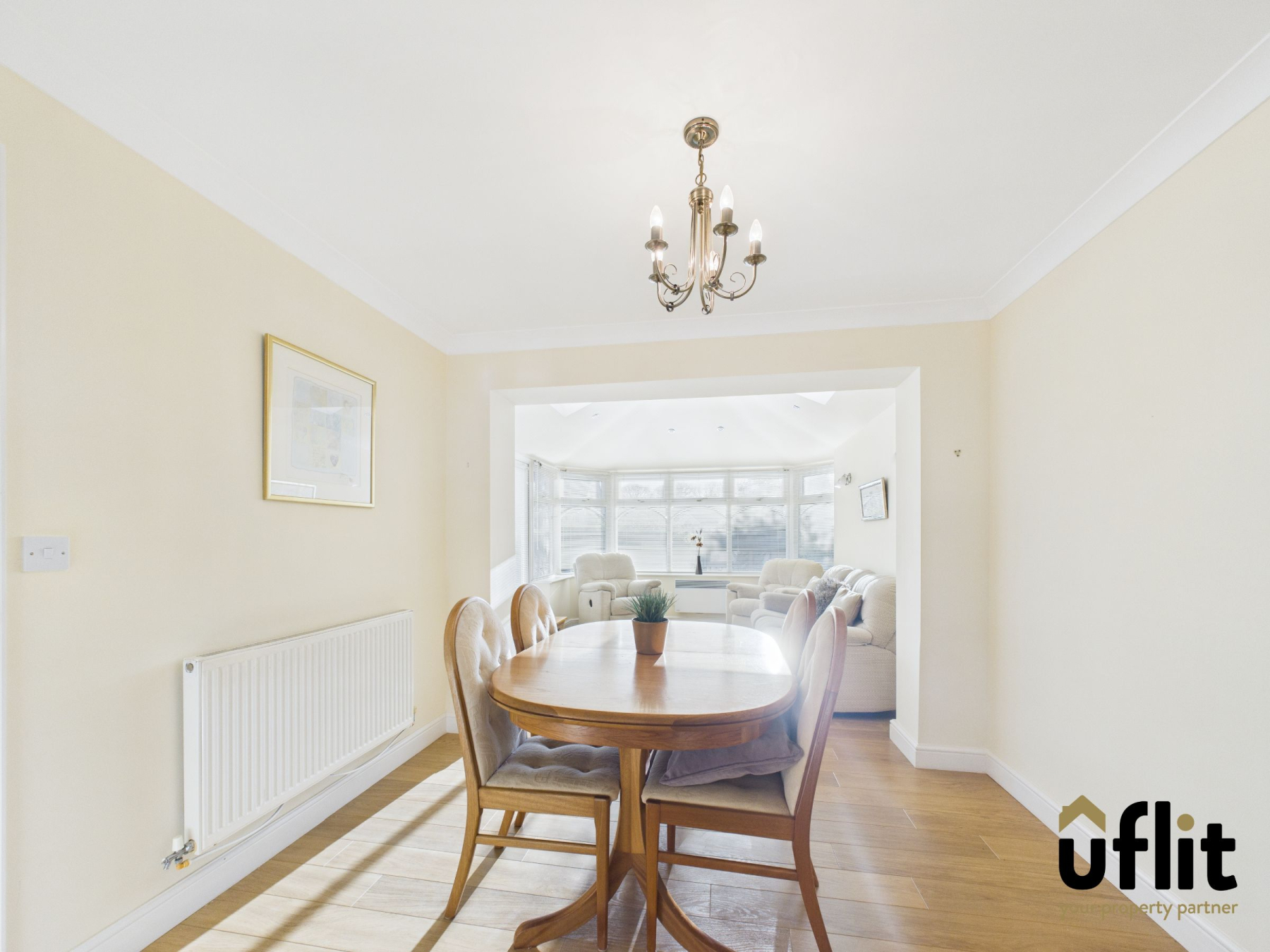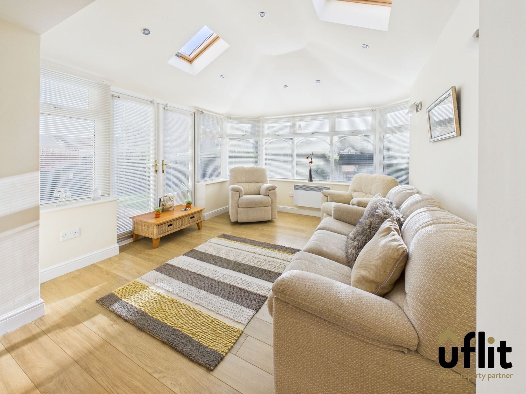 This versatile additional reception room is ideal as a dining space or snug and features laminate flooring and a radiator. The room opens into an extended conservatory fitted with an all-year-round roof, allowing for comfortable use throughout the seasons. Glass French doors lead out to the garden, seamlessly connecting indoor and outdoor living.