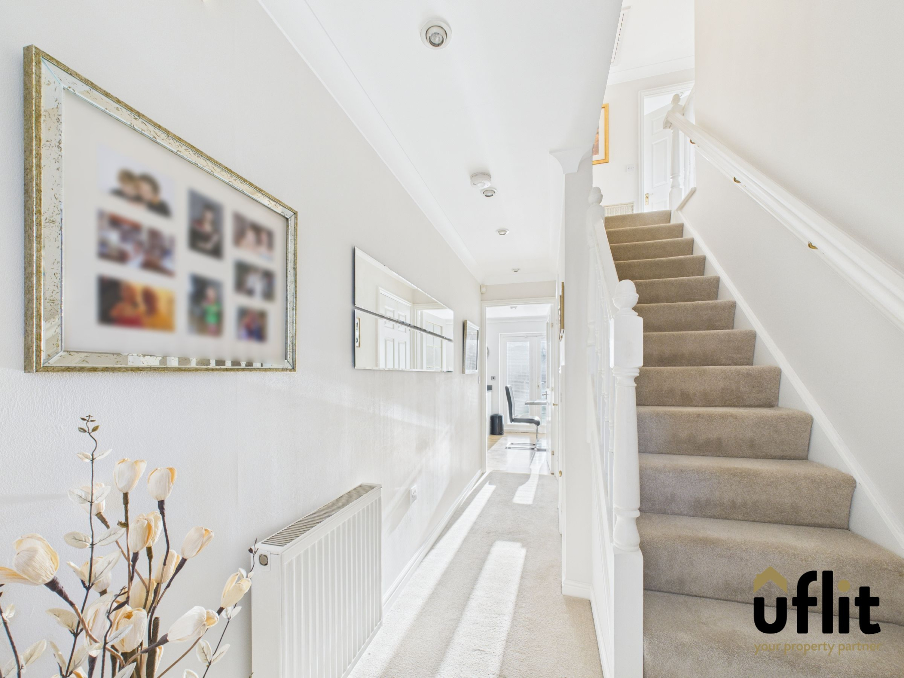 The property is entered via a UPVC front porch with laminate flooring, leading through a wooden front door into a welcoming carpeted hallway. The hallway features a radiator, white spindle staircase rising to the first floor and a useful understairs storage cupboard, creating a practical and inviting first impression.