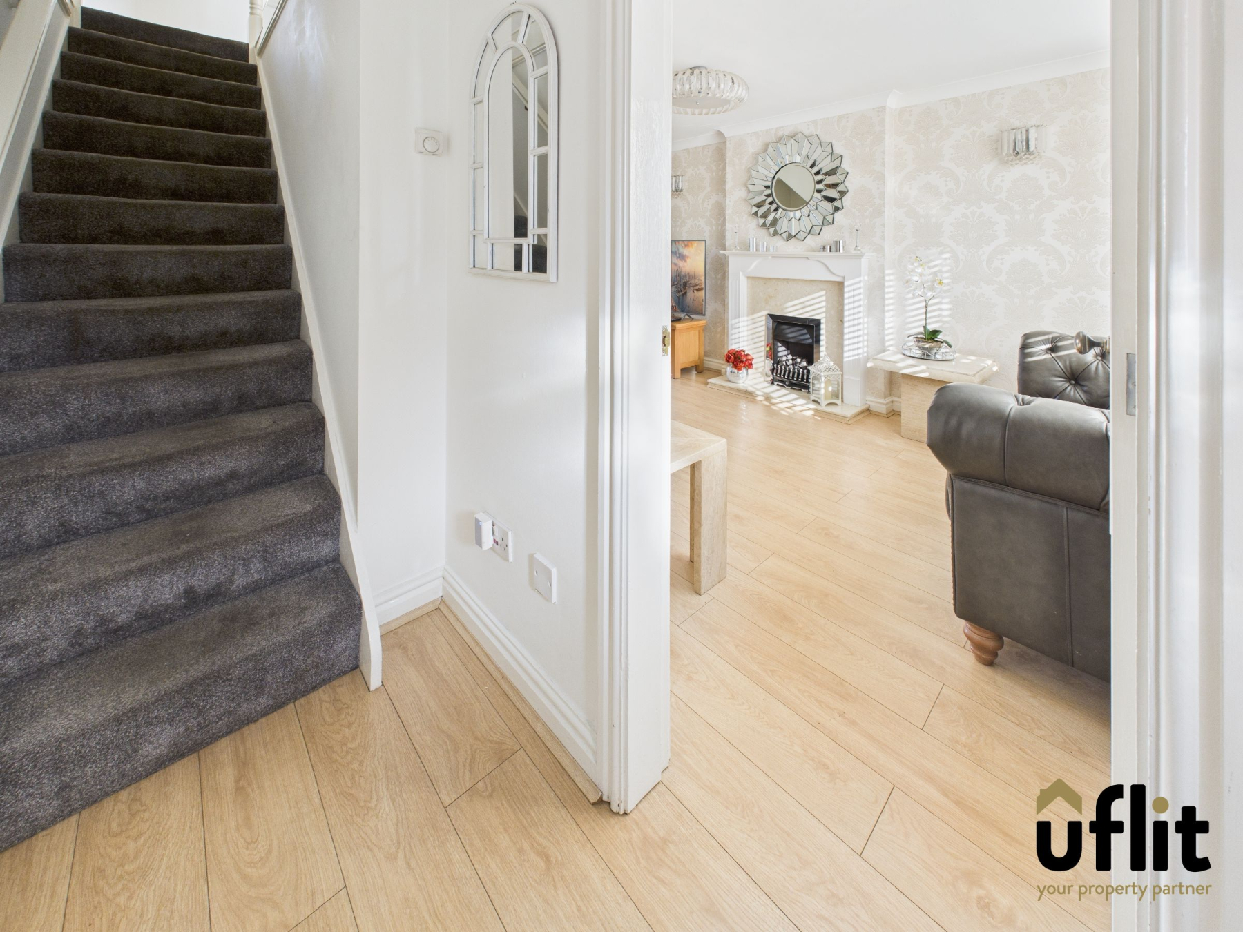 Welcoming you in through a front entrance door, the hallway features laminate flooring and gives access to the lounge. Carpeted stairs lead to the first floor.