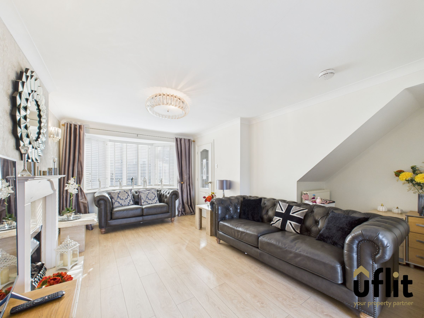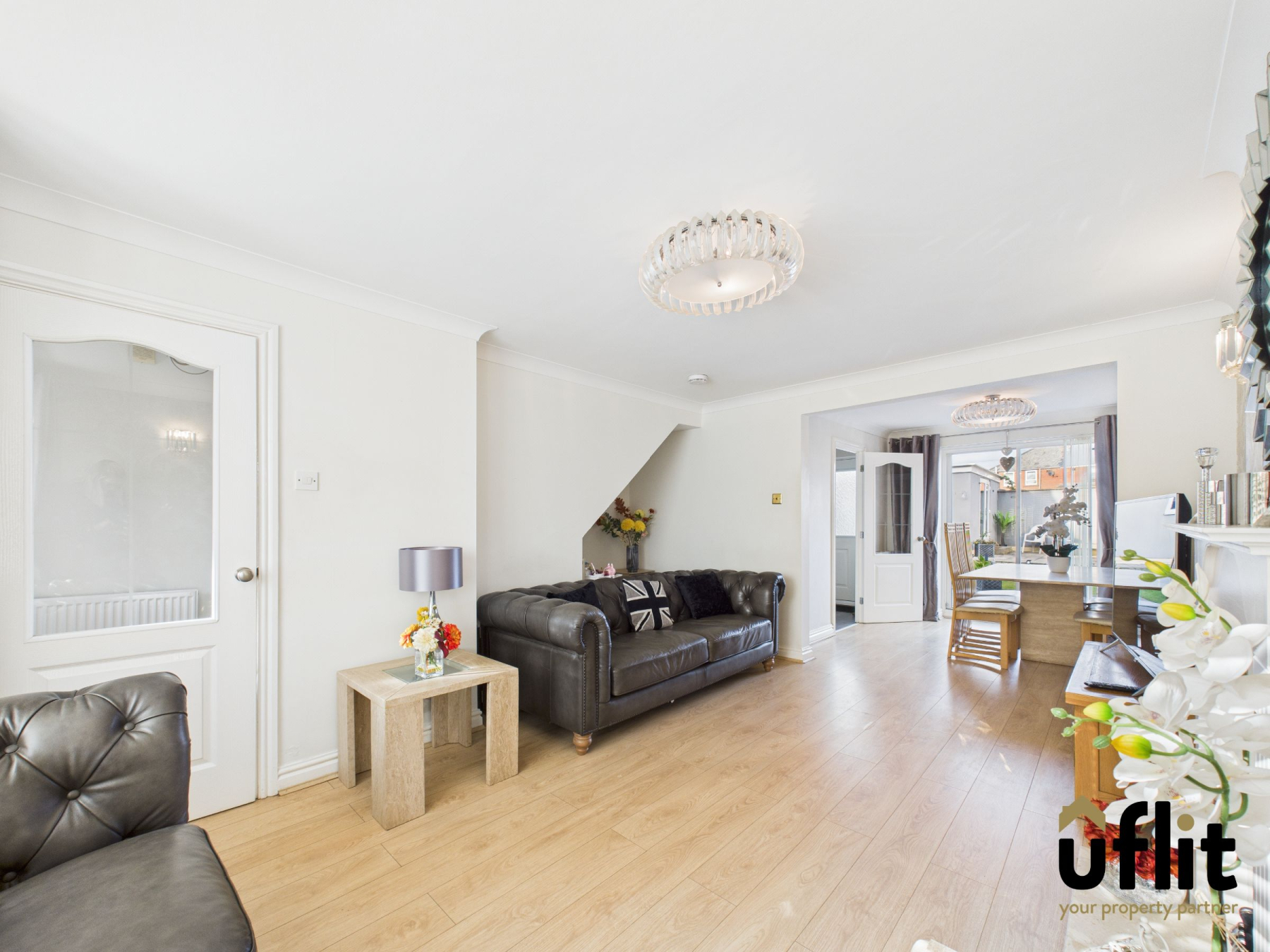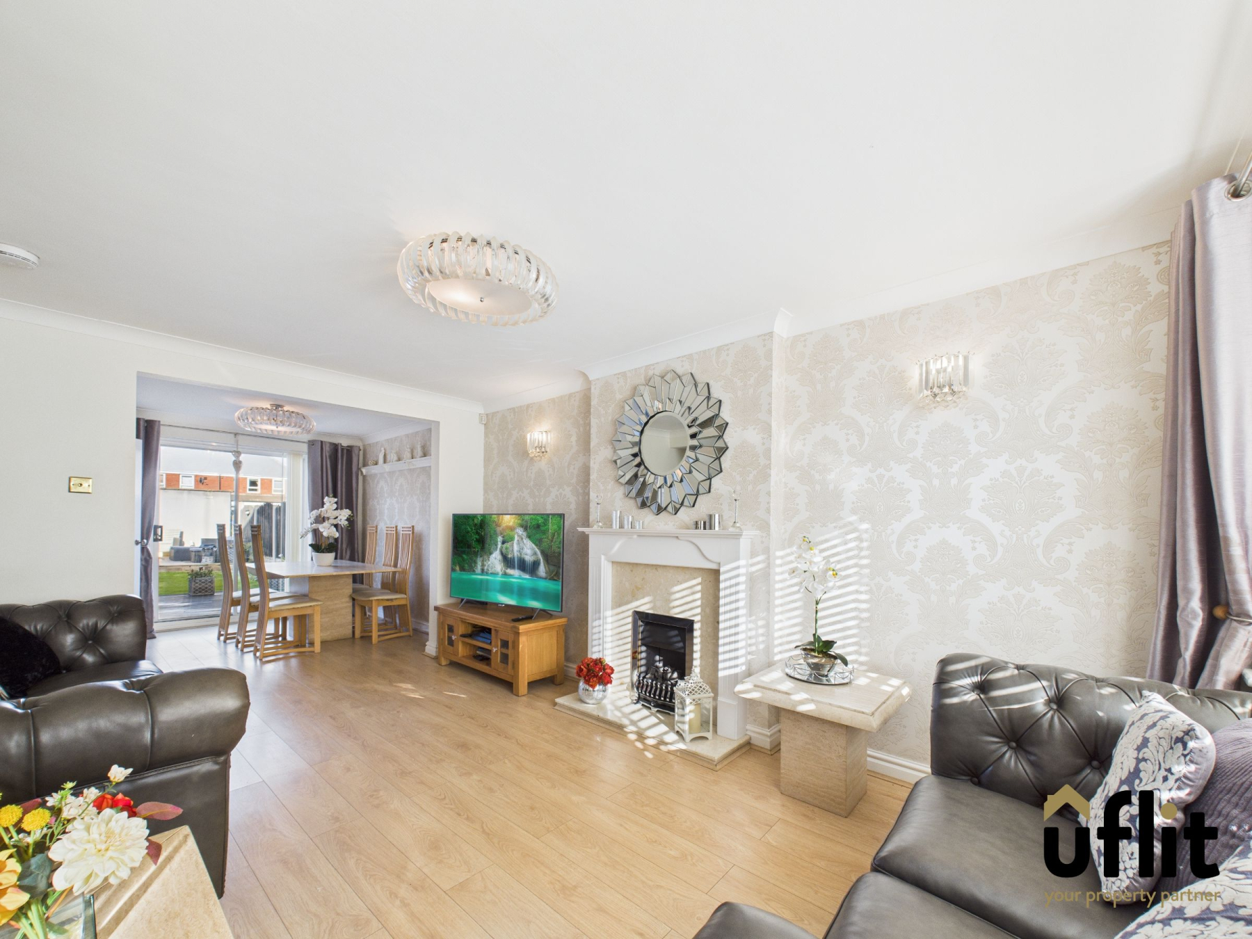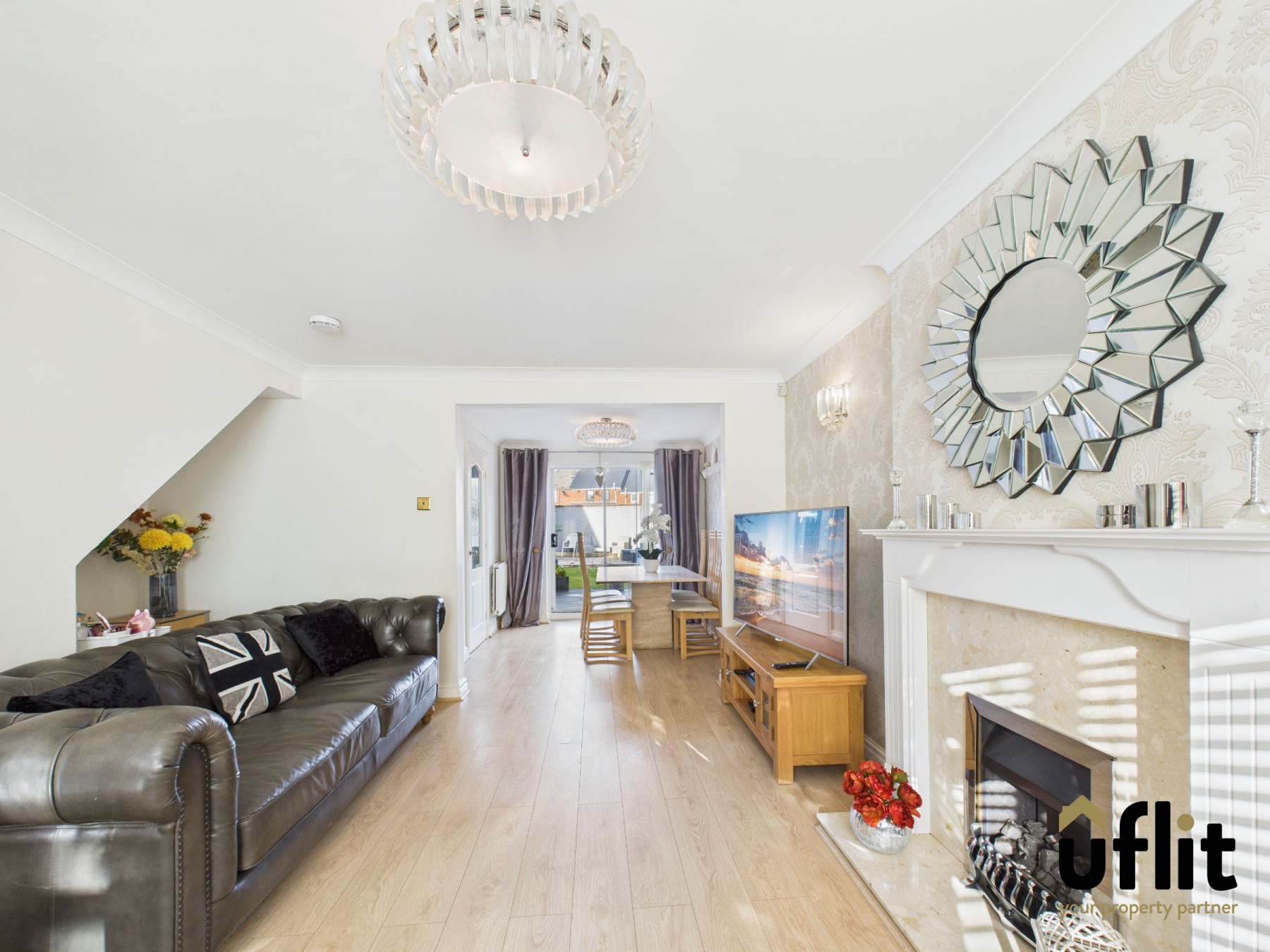 A spacious and light-filled open-plan living area with laminate flooring flowing through from the hallway. The front-facing bay window allows natural light to flood the room and a gas fire with elegant surround and marble hearth creates a homely focal point. A wide opening to the dining area gives a perfect flow for entertaining, with sliding patio doors leading out to the rear garden and a door into the kitchen.