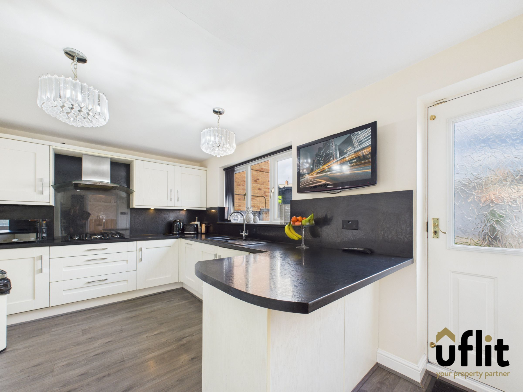 Modern and stylish with a range of fitted wall and base units, matching backsplash, and ample worktop space. Equipped with a five-ring gas hob, extractor, integrated fridge/freezer, dishwasher and double oven. A rear-facing window overlooks the garden, and there's a composite door for outdoor access. Finished with laminate flooring and a tall anthracite radiator, the kitchen also leads to a downstairs WC and bedroom.