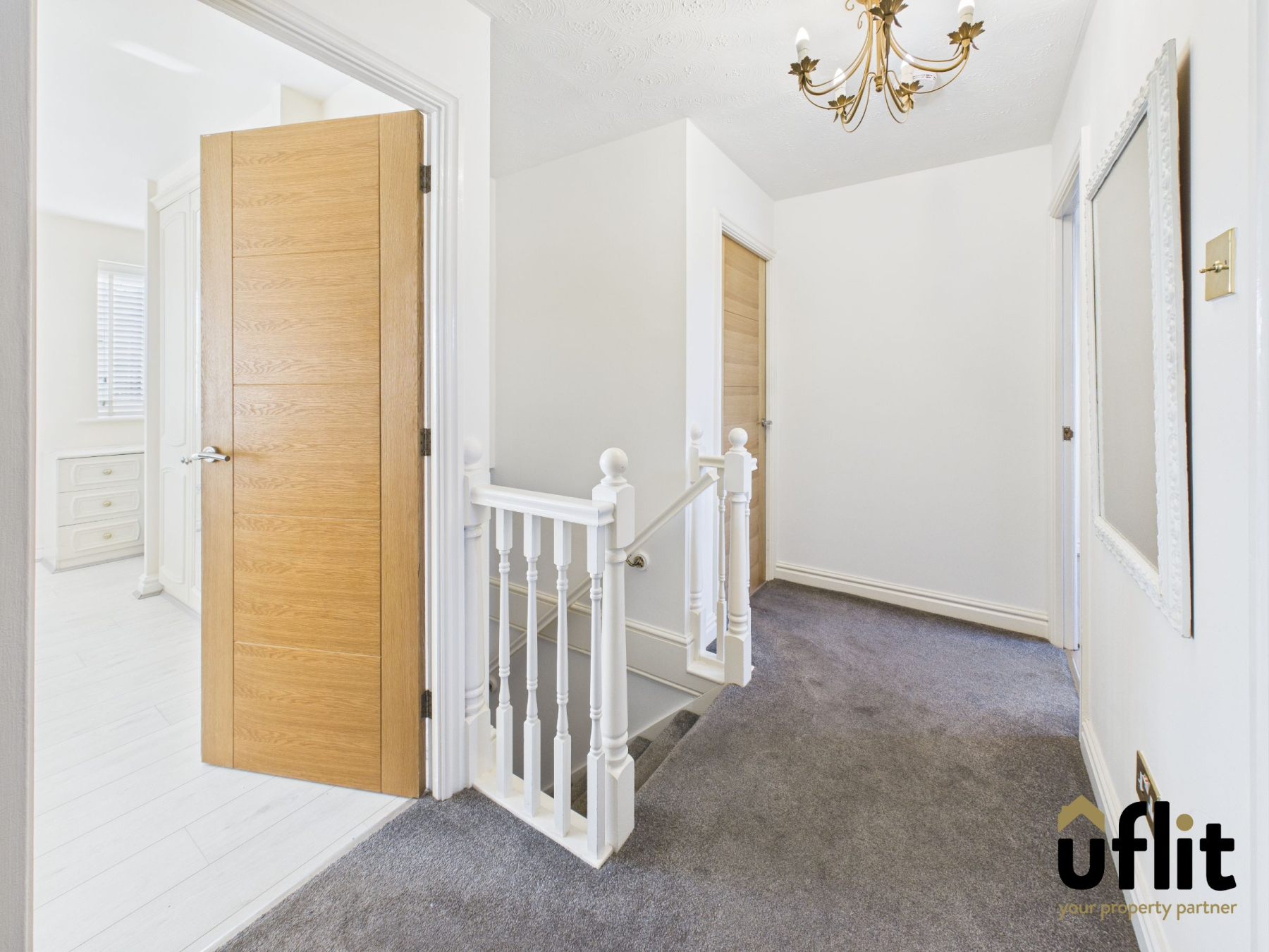 Carpeted landing with loft access, storage cupboard and doors leading to four bedrooms and the family bathroom.