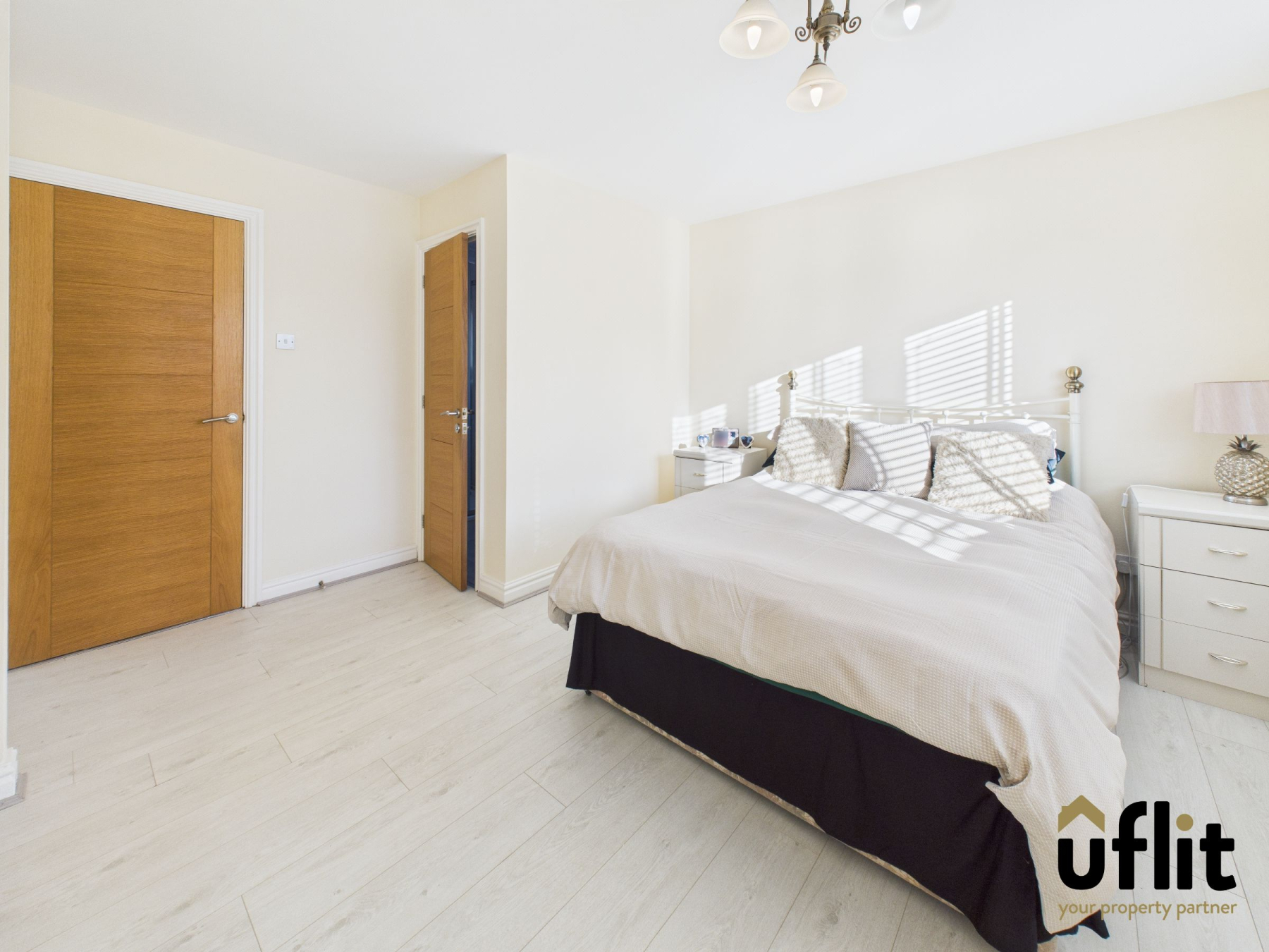 A beautifully presented master bedroom with laminate flooring, fitted wardrobes and built-in dressing table. Front-facing window allows lots of light. Door leads to the en-suite.
