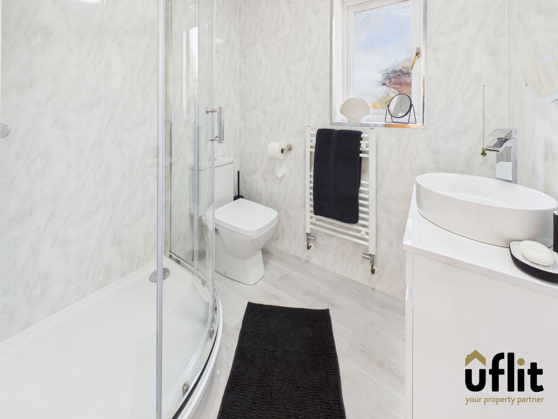 A modern and well-finished en-suite featuring a shower cubicle with glass enclosure, WC, and sink inset of a modern vanity unit. Finished with laminate flooring, white towel radiator, PVC cladding to walls and ceiling and a side-facing window.
