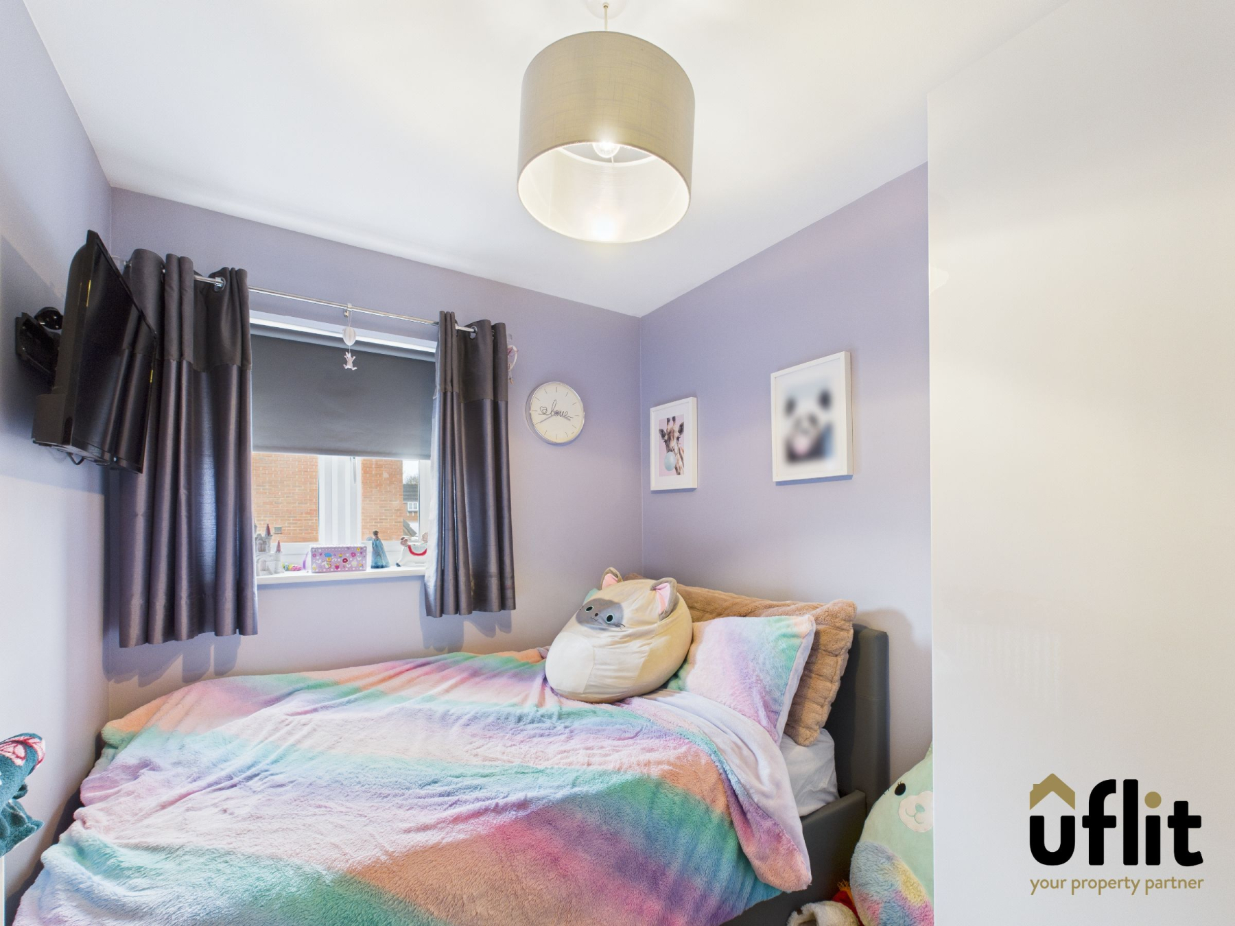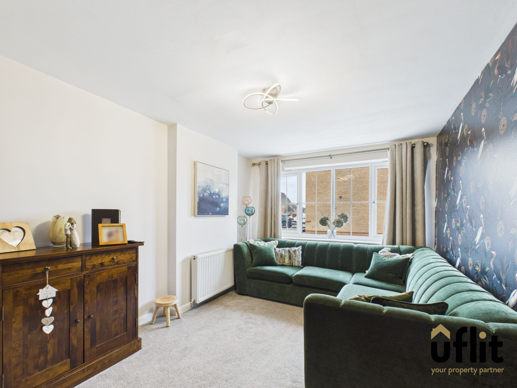 A contemporary space, formerly the converted garage and currently used as a living room, offering excellent versatility and the potential to be utilised as a fourth bedroom again. Finished with carpeted flooring, a front-facing window, an impressive media wall and two radiators.