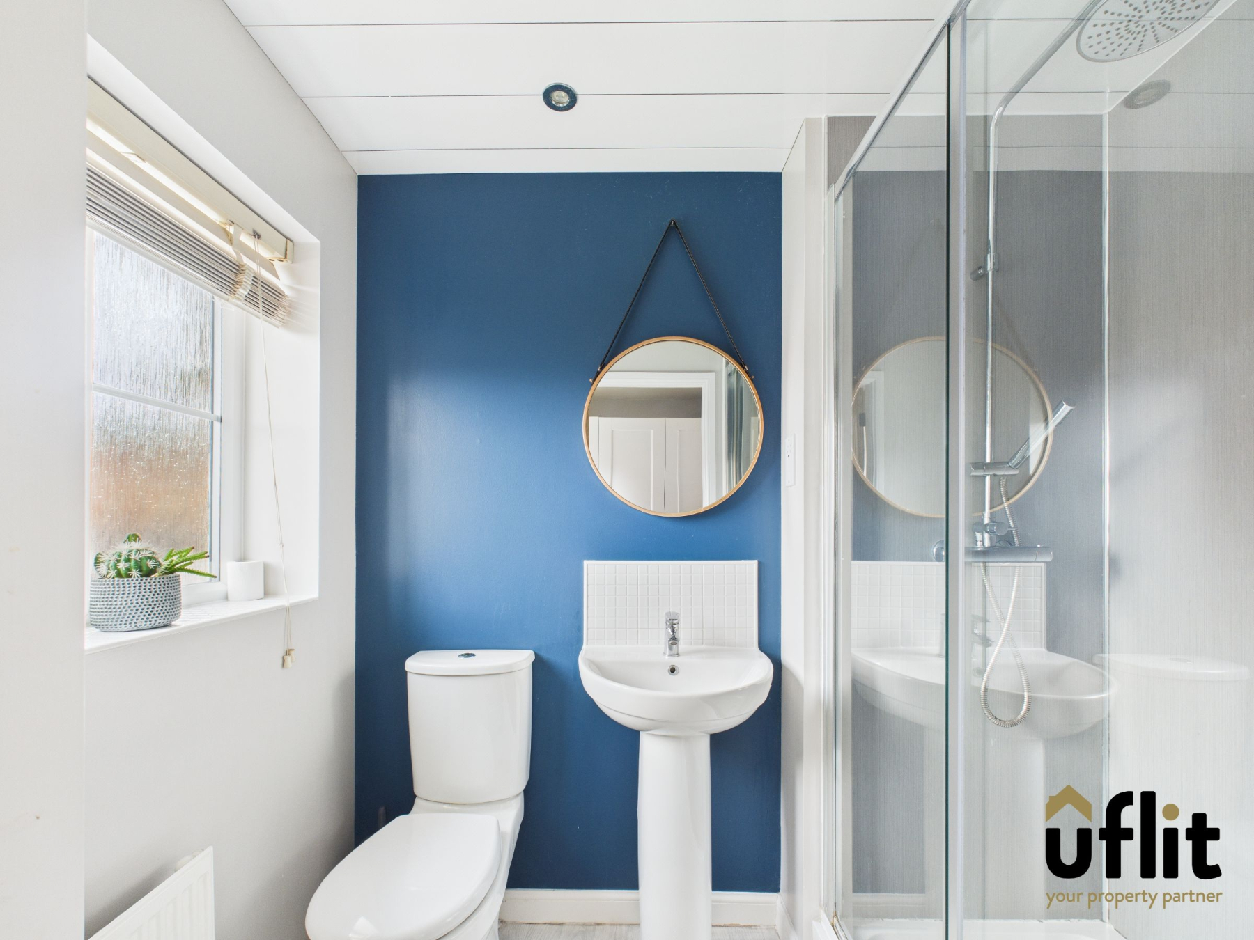 Includes lino flooring, rear-facing window, radiator, low-level WC, wash basin with tiled splashback and a shower with dual shower heads.