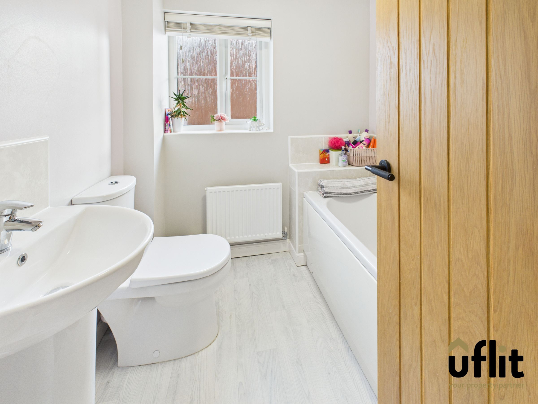 Finished with Lino flooring, a rear facing window, radiator, low-level WC, wash basin with tiled splashback and a fitted bath.