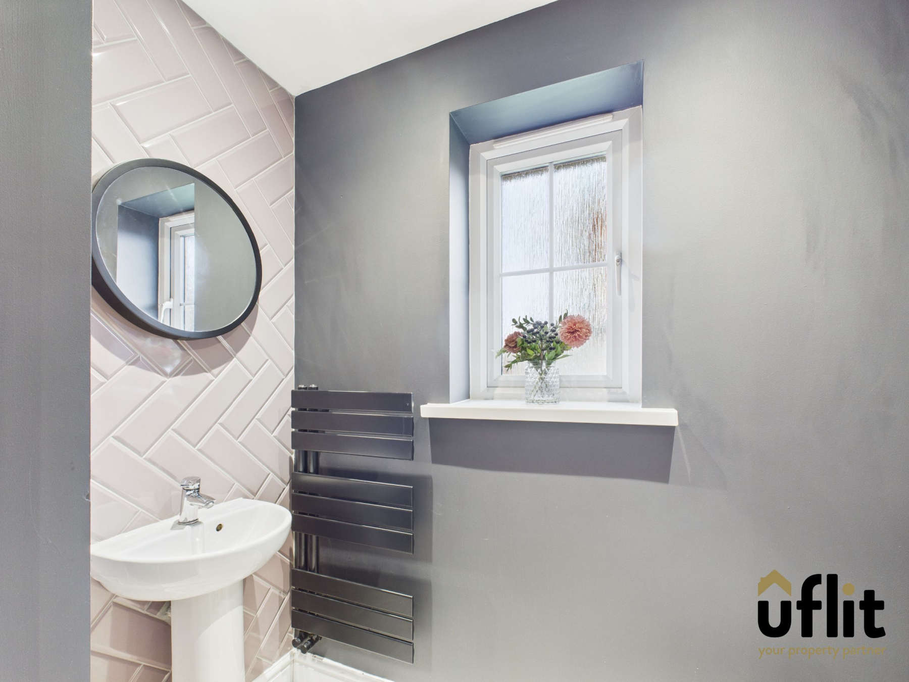 Featuring a low level WC, wash basin, towel rail radiator, rear facing window and a striking herringbone tile feature wall.