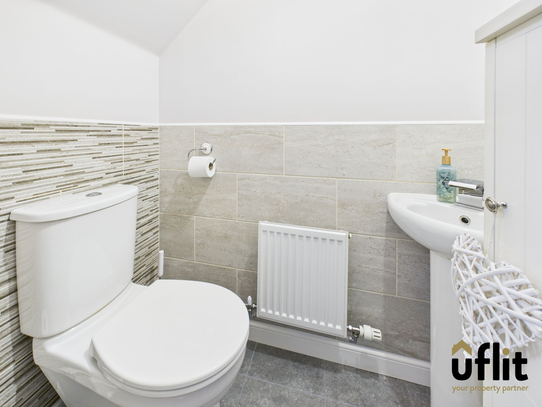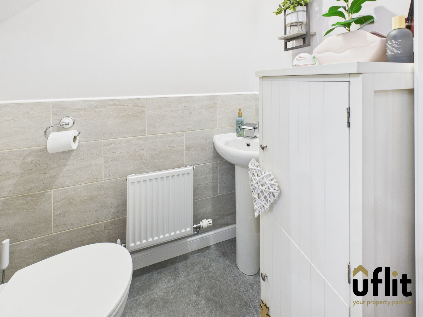 The downstairs WC is finished with vinyl flooring and partially tiled walls. It comprises a low-level WC, wash basin and radiator, providing a convenient facility for guests and family use.