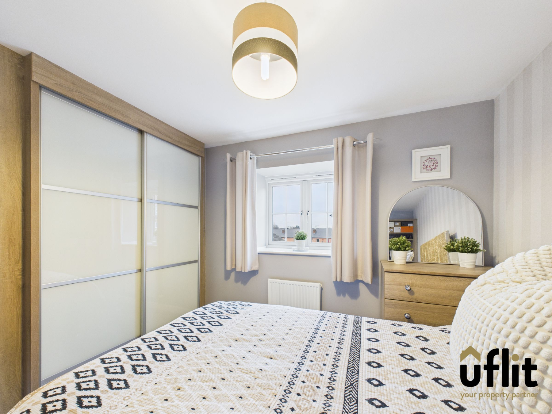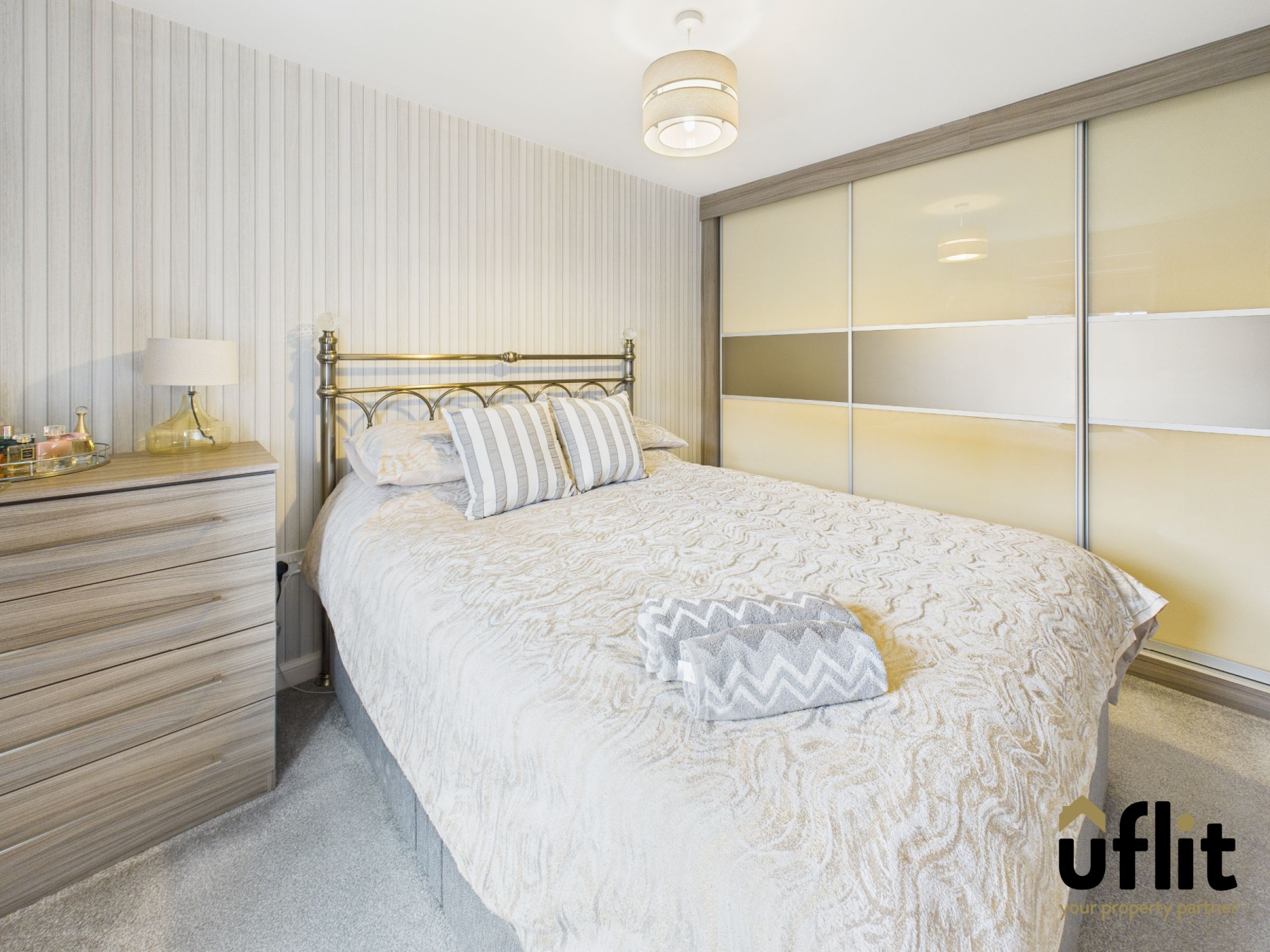 This double bedroom is positioned to the front of the property and benefits from carpeting, a radiator and fitted wardrobes. A box window allows for plenty of natural light while offering an attractive outlook.