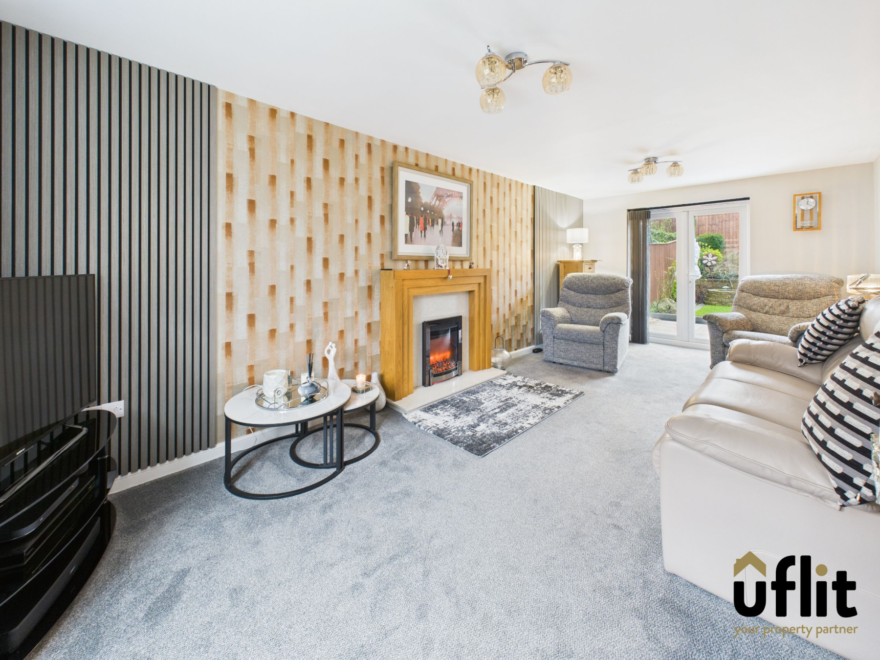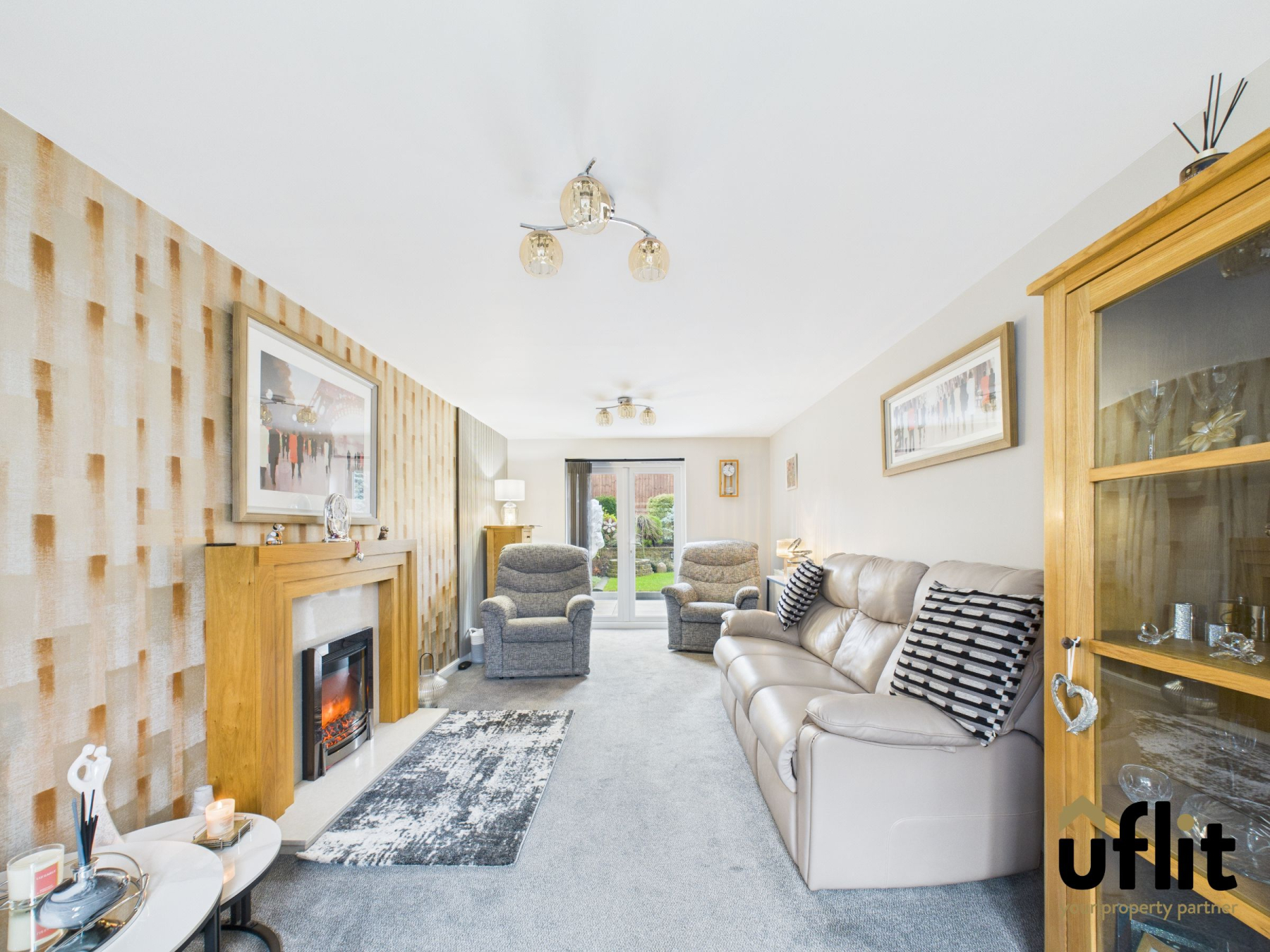 The spacious lounge is beautifully presented with soft carpeting and enjoys natural light from the front-facing window. A striking oak fire surround with electric fire and marble back creates a focal point within the room, adding warmth and character. French doors to the rear open directly onto the garden, seamlessly connecting indoor and outdoor living spaces. Radiators complete this comfortable and inviting room.