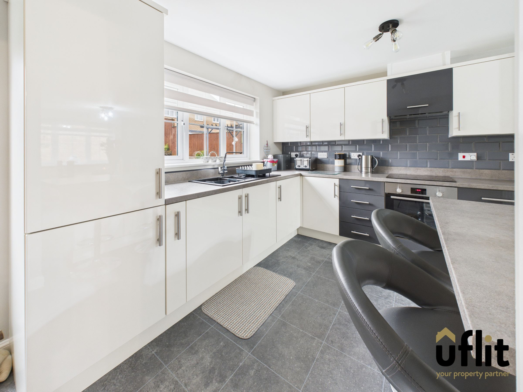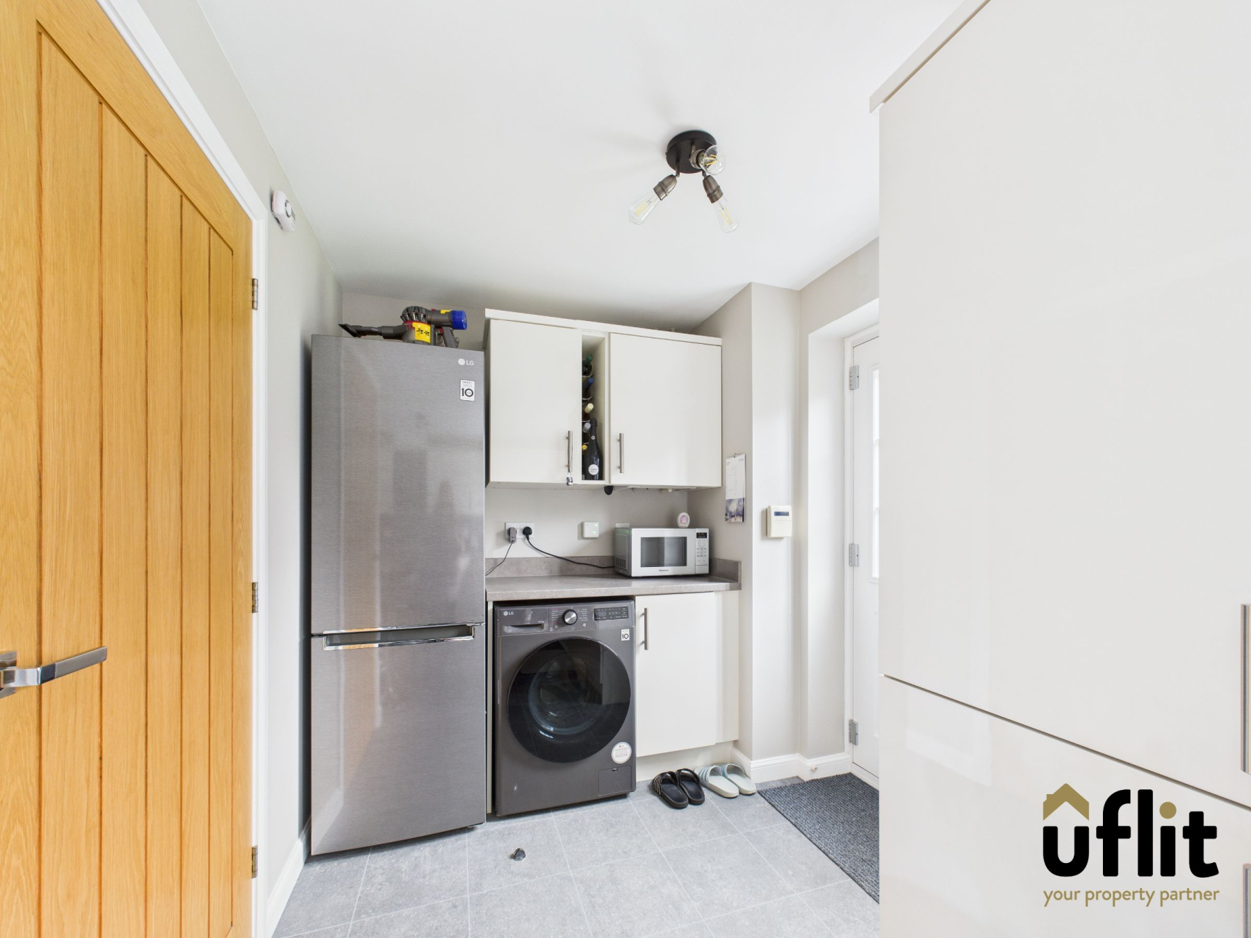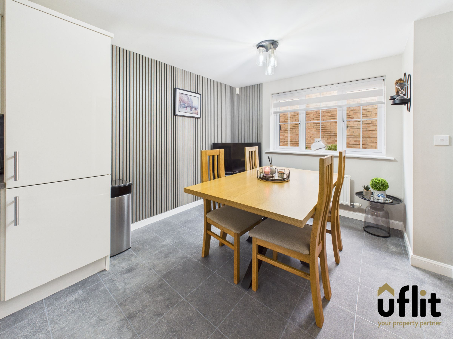 Accessed via double glass doors, the kitchen diner is a fantastic family and entertaining space. Finished with durable vinyl flooring, the kitchen features an integrated electric oven, ceramic electric hob and extractor fan with lighting. There is ample space for a dishwasher, washing machine and fridge freezer. Windows to both the front and rear allow plenty of natural light, while a composite door provides direct access to the garden. A further internal door leads back into the hallway, enhancing the practicality of the layout.