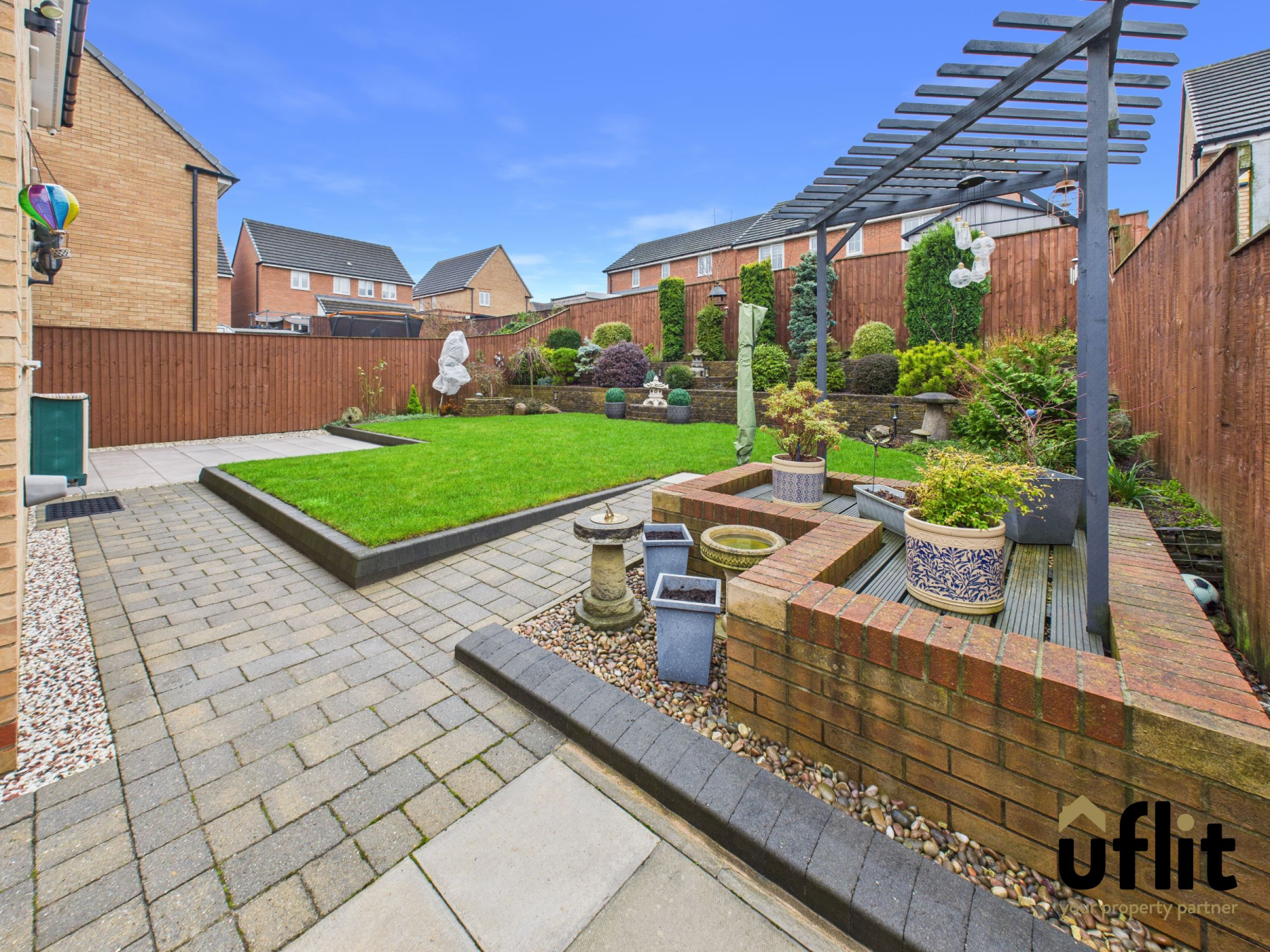 To the rear, the property boasts a beautifully maintained south-facing garden designed for low maintenance living. A patio area with ceramic paving slabs provides an ideal seating and entertaining space, complemented by a lawned area and a tiered stone wall perfect for shrubbery. The garden is fully enclosed and includes a winding awning for shaded seating, an outside tap and a neat, tidy finish throughout. Double sheds provide excellent storage and are located down the side of the property, along with a designated bin storage area.