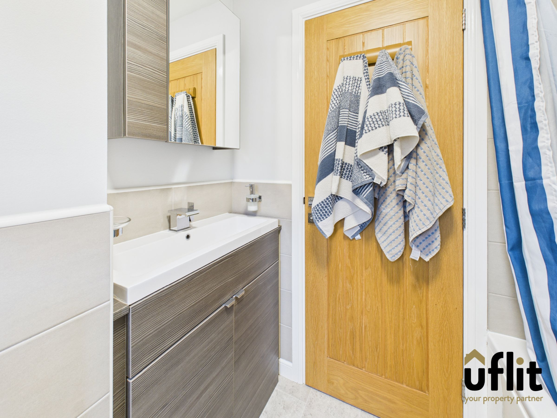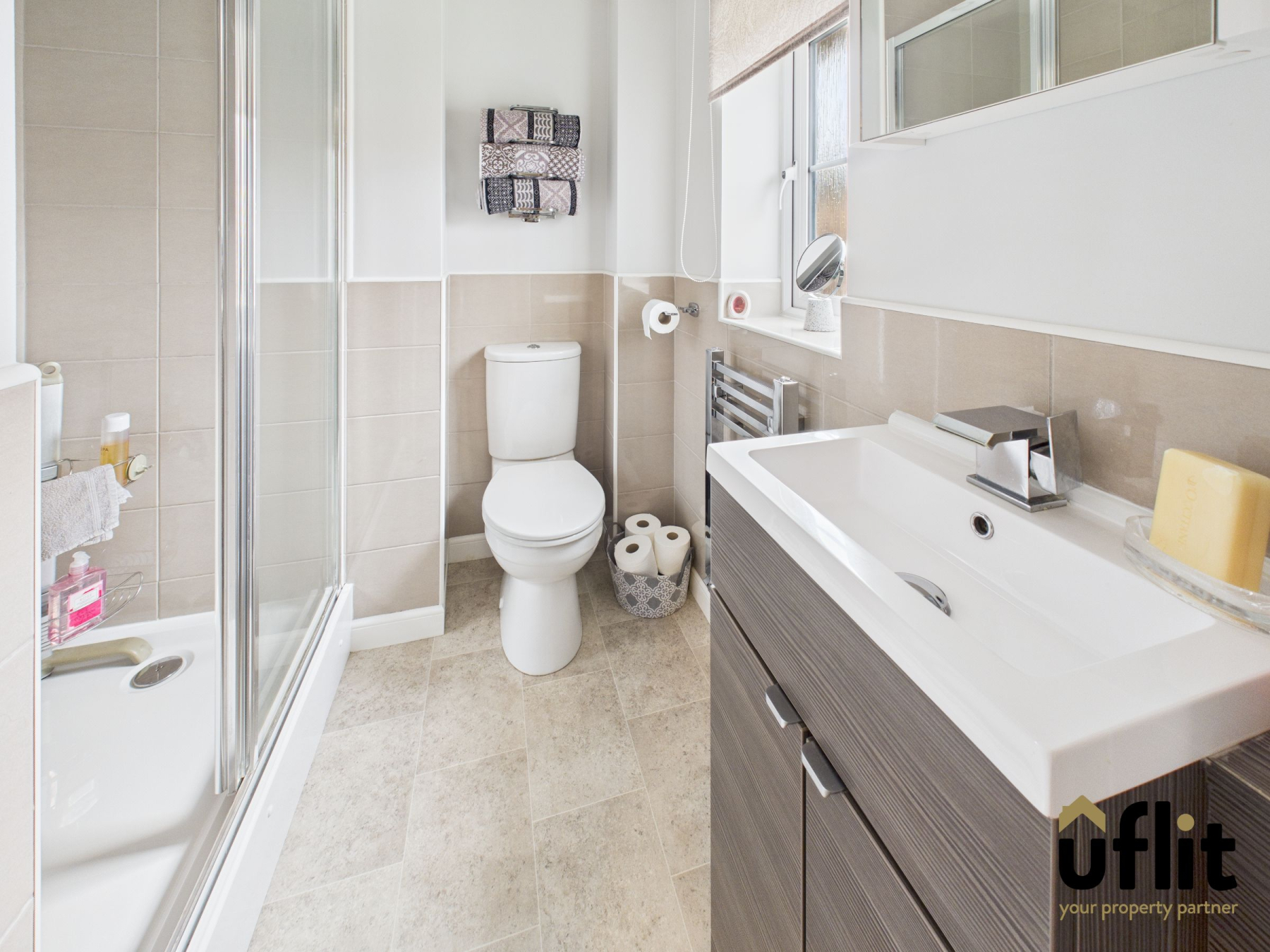 The ensuite is finished with vinyl flooring and comprises a low-level WC, wash basin set over a cupboard for storage and a towel radiator. A rear-facing window allows for natural light and ventilation.