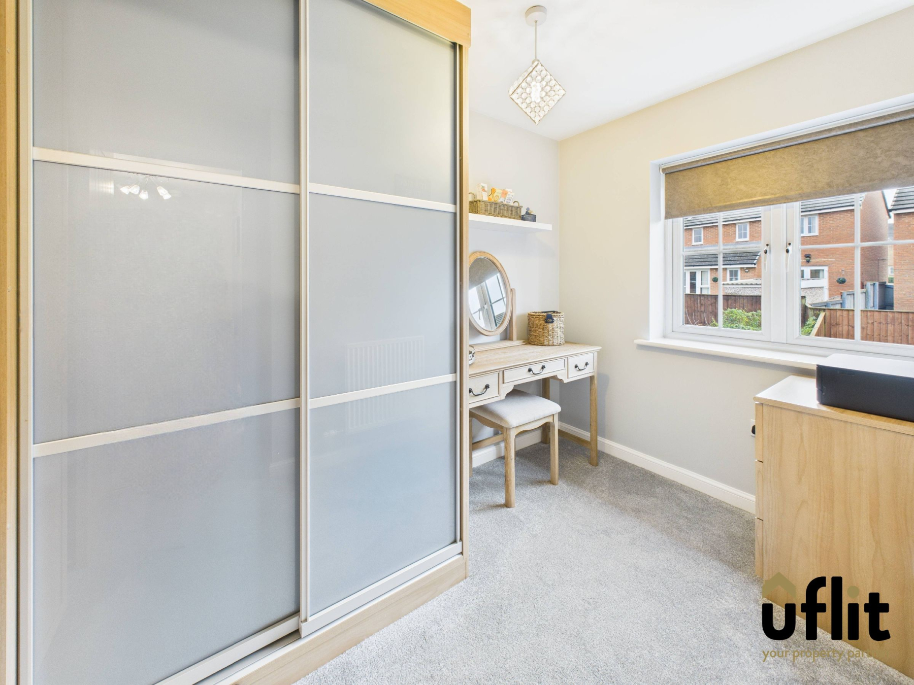 Bedroom four is carpeted and includes a fitted wardrobe and radiator. A rear-facing window overlooks the garden, making it ideal as a bedroom, home office or nursery.