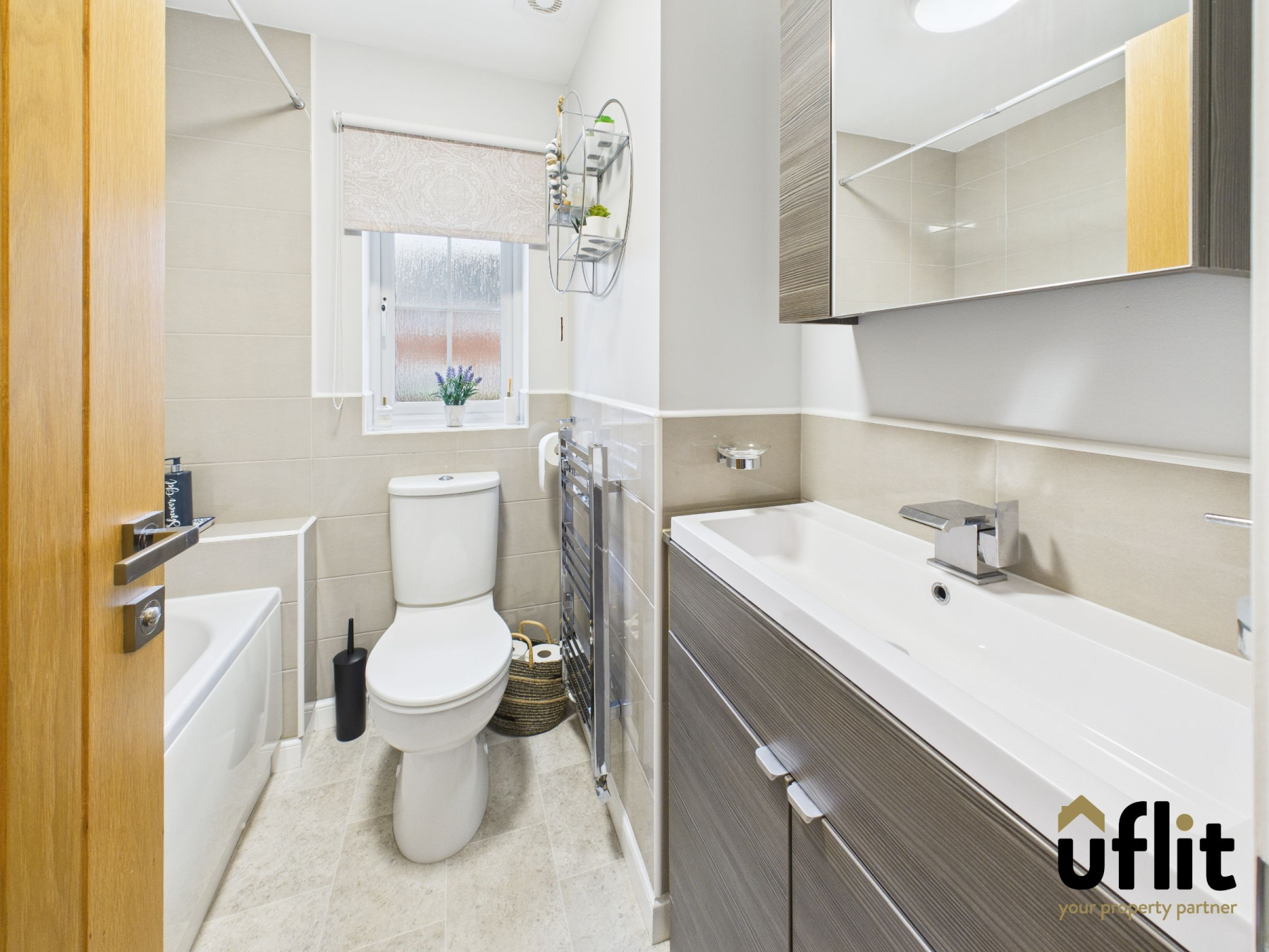 The family bathroom is finished with vinyl flooring and includes a low-level WC, wash basin with storage cupboard beneath, a towel radiator and a bath with shower over. A rear-facing window provides natural light and ventilation.