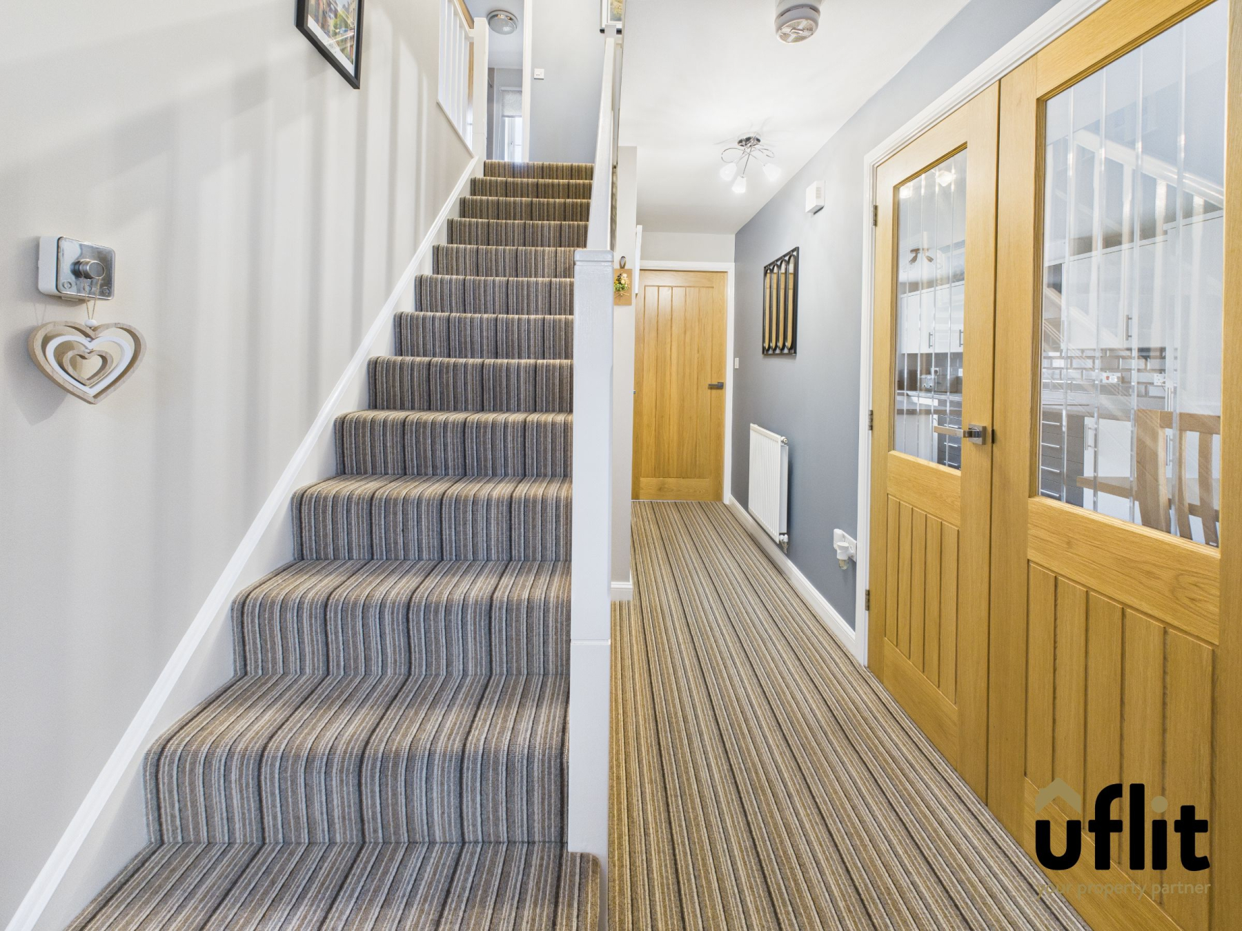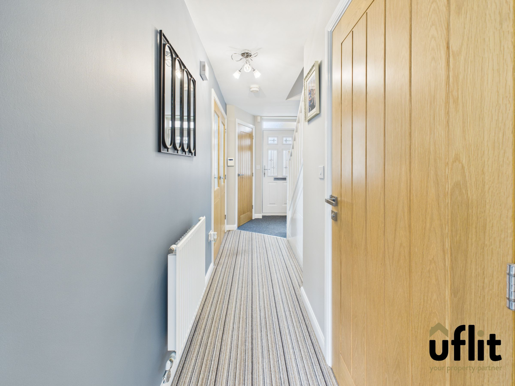 The welcoming entrance hallway is carpeted and provides a practical yet stylish introduction to the home. There is a useful storage cupboard ideal for coats and shoes, along with built-in understairs storage offering excellent additional space. A radiator ensures comfort and the hallway provides access to the main living areas and staircase to the first floor.