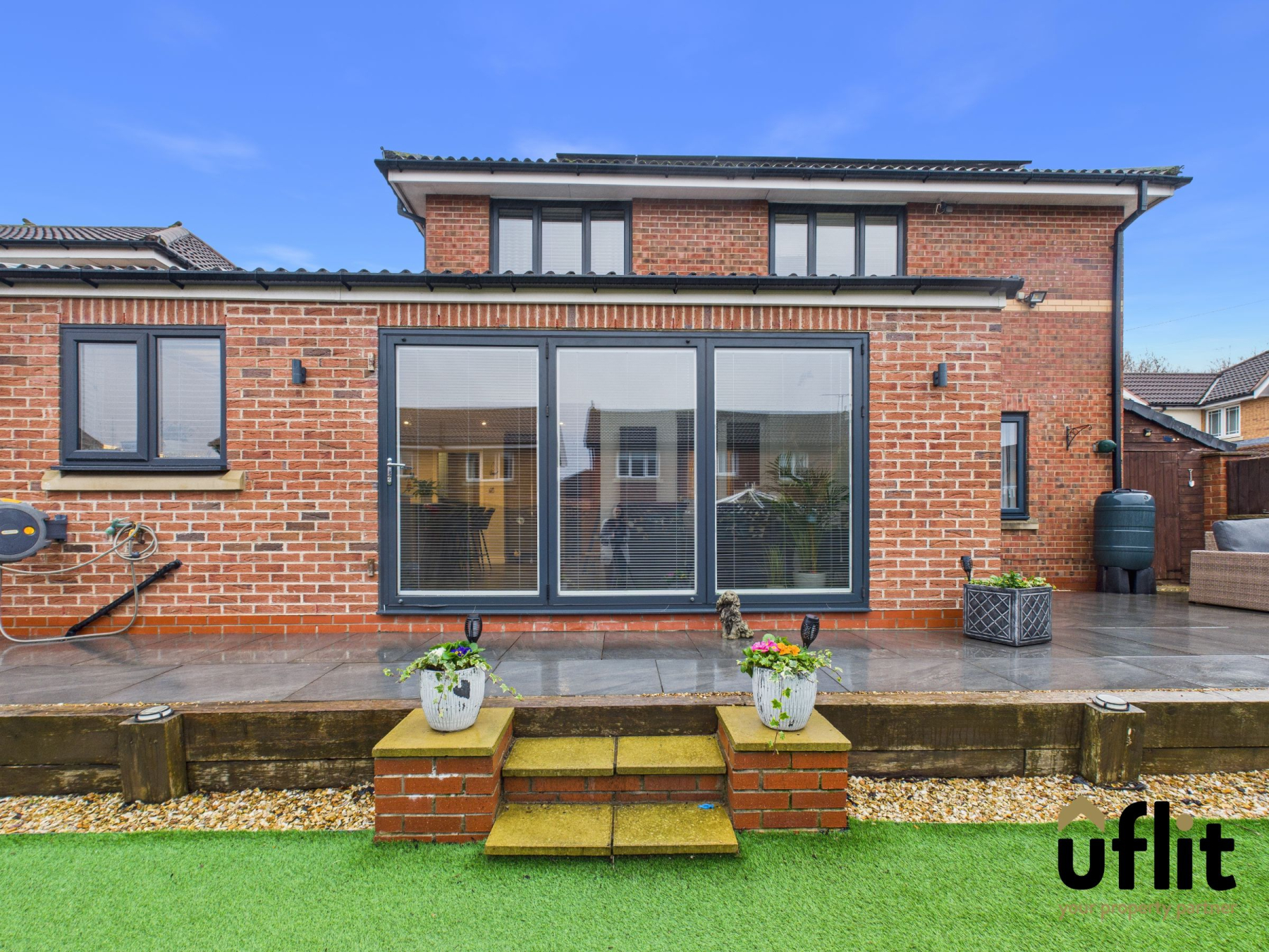 The fully enclosed SOUTH FACING rear garden has been carefully landscaped to create a private and low-maintenance outdoor space. A tiered garden wall leads onto porcelain tiled areas with steps down to an artificial lawn. Raised shrubbery beds add structure, while the porcelain tiled seating area and south facing terraced seating space with wooden pergola provide ideal areas for relaxing or entertaining. A useful side shed offers additional storage, with gated access linking the front and rear of the property.