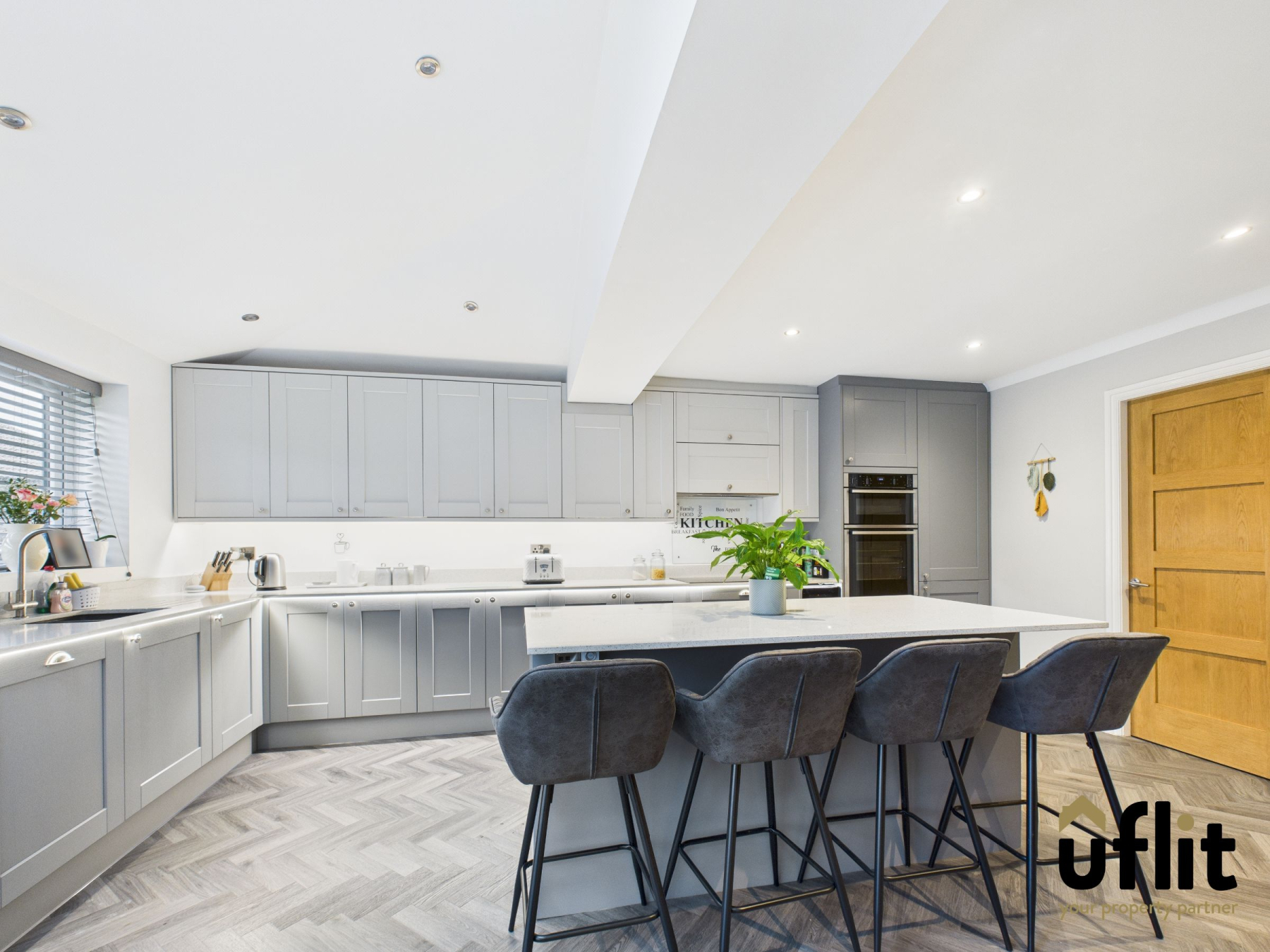 The stunning kitchen and dining area truly forms the heart of this exceptional home, combining striking design with outstanding practicality. Beautifully appointed with a comprehensive range of contemporary wall and base units, including full-height larder cupboards, the space is finished with elegant granite worktops and coordinating upstands. A large central island with breakfast bar provides a stylish focal point, perfect for both everyday family living and entertaining.