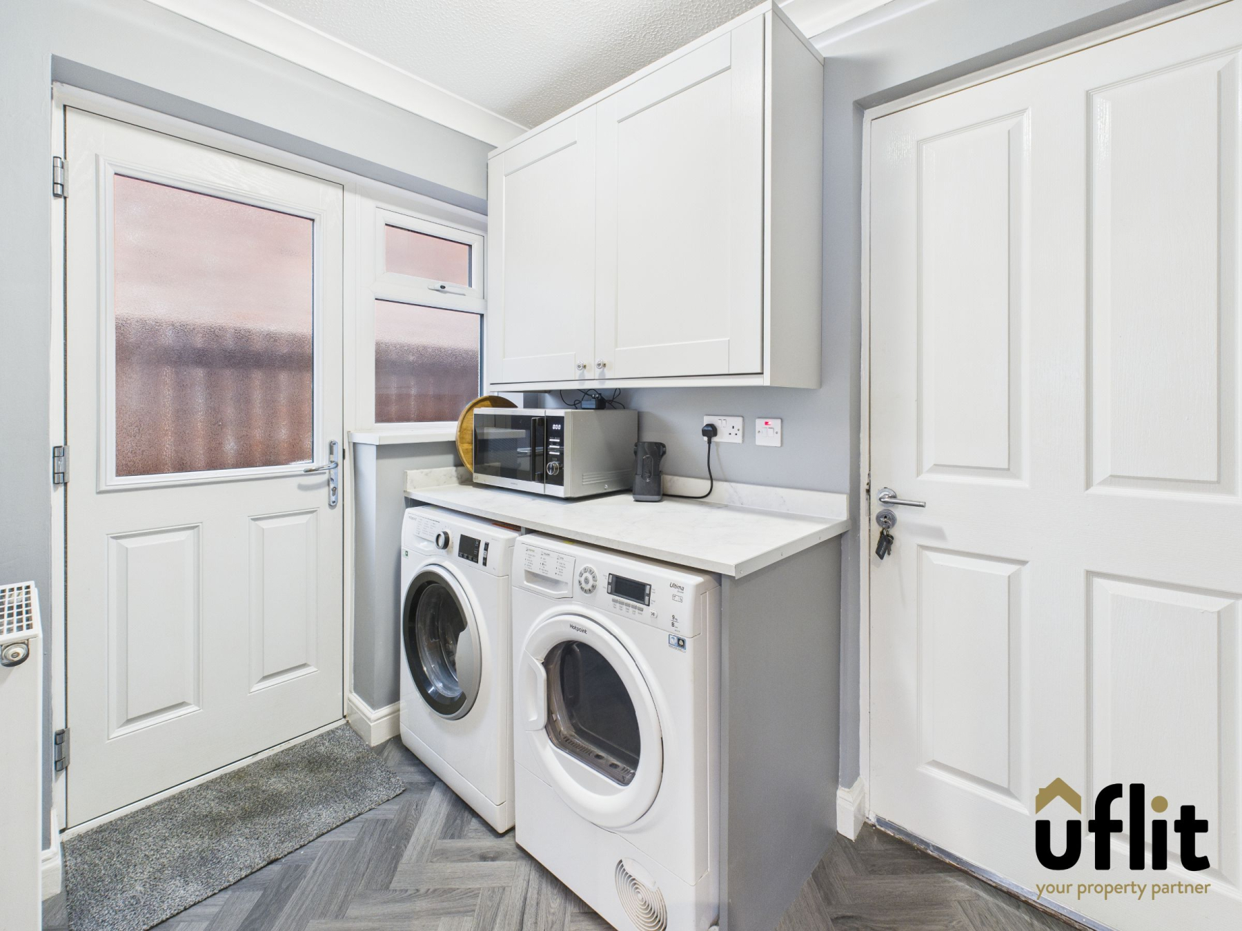 The utility room continues the LVT flooring from the kitchen and offers additional wall units and worktop space. There is provision for a washing machine and tumble dryer, along with internal access to the integral garage and an external door to the side of the property.