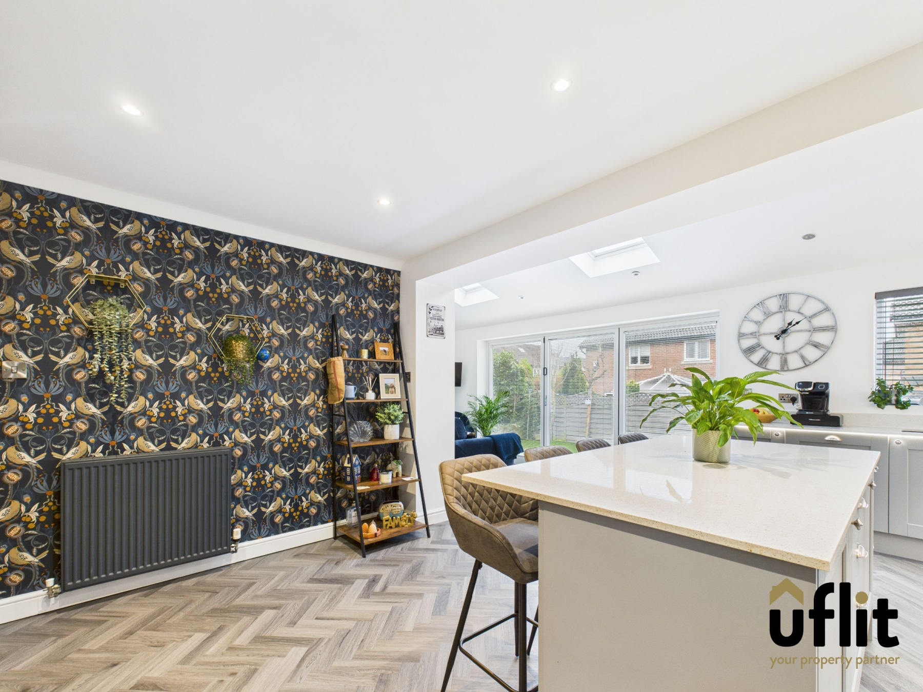 The living area within the kitchen benefits from bi-folding doors opening directly onto the rear garden, creating a seamless indoor-outdoor living experience. An envelope style window to the side elevation and two opening Velux windows further enhances the light and sense of space.