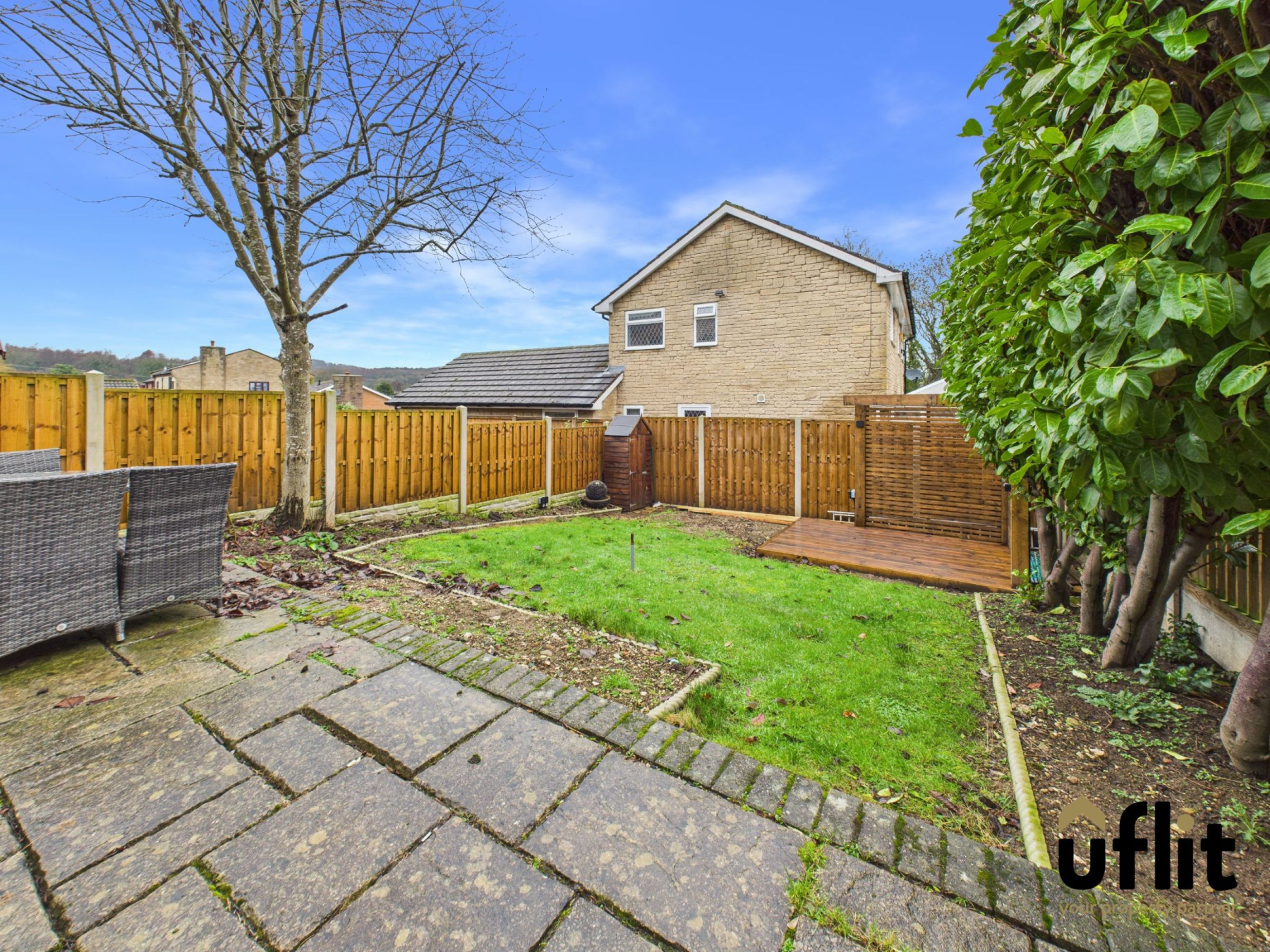 To the rear is a fully enclosed garden featuring a paved patio area, lawn and wooden decking to the rear. Mature trees and shrubbery provide privacy and a pleasant outdoor setting.