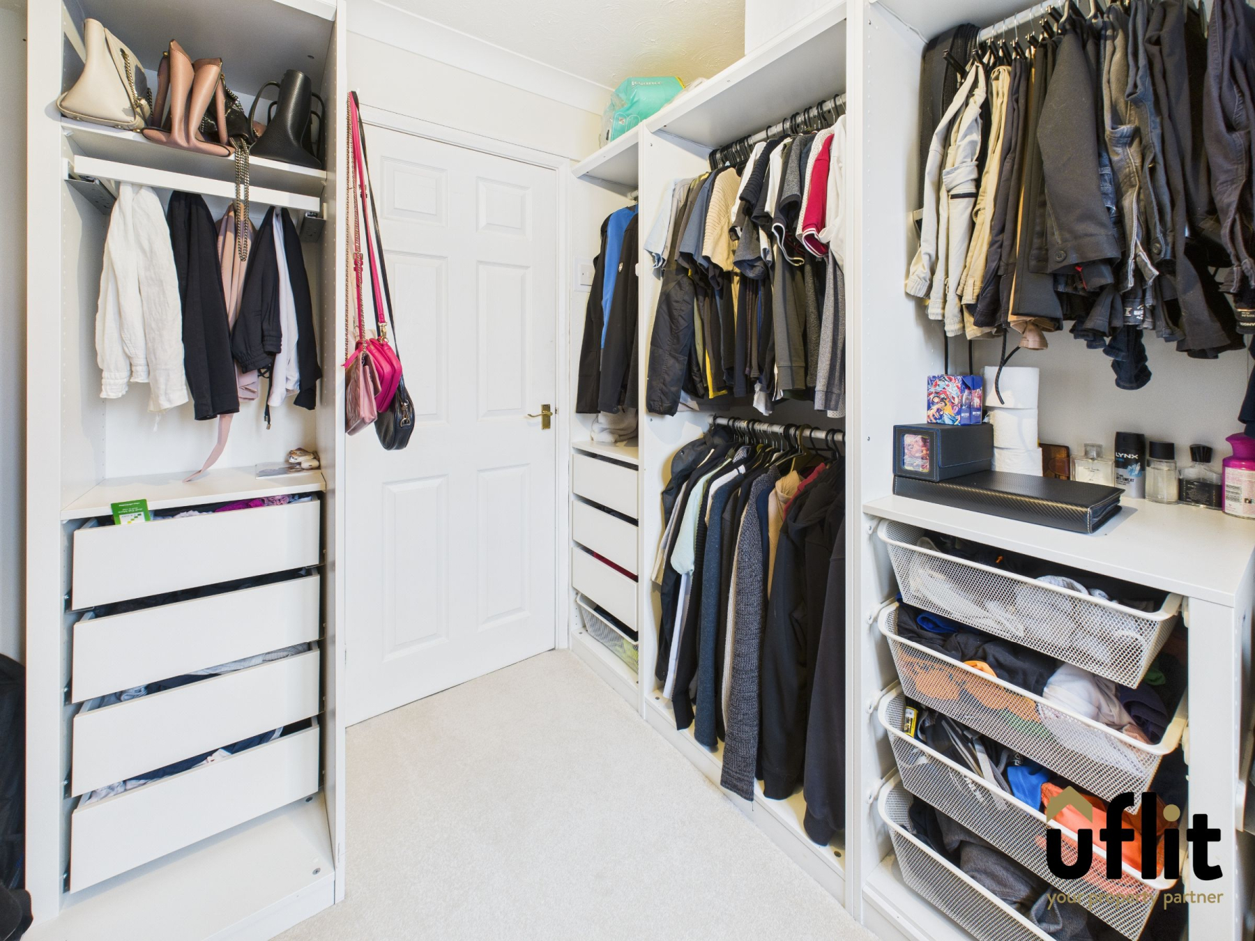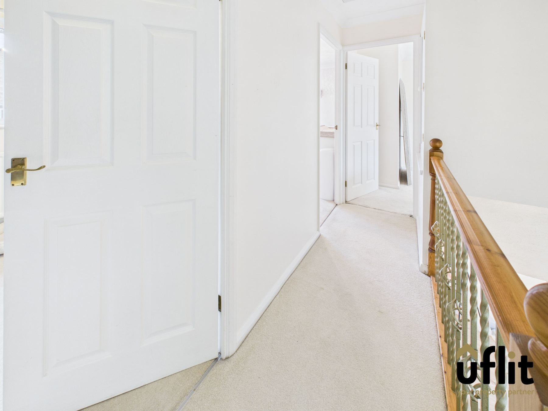 Carpeted stairs lead to a landing with radiator, storage cupboard, and loft hatch providing access to additional storage.