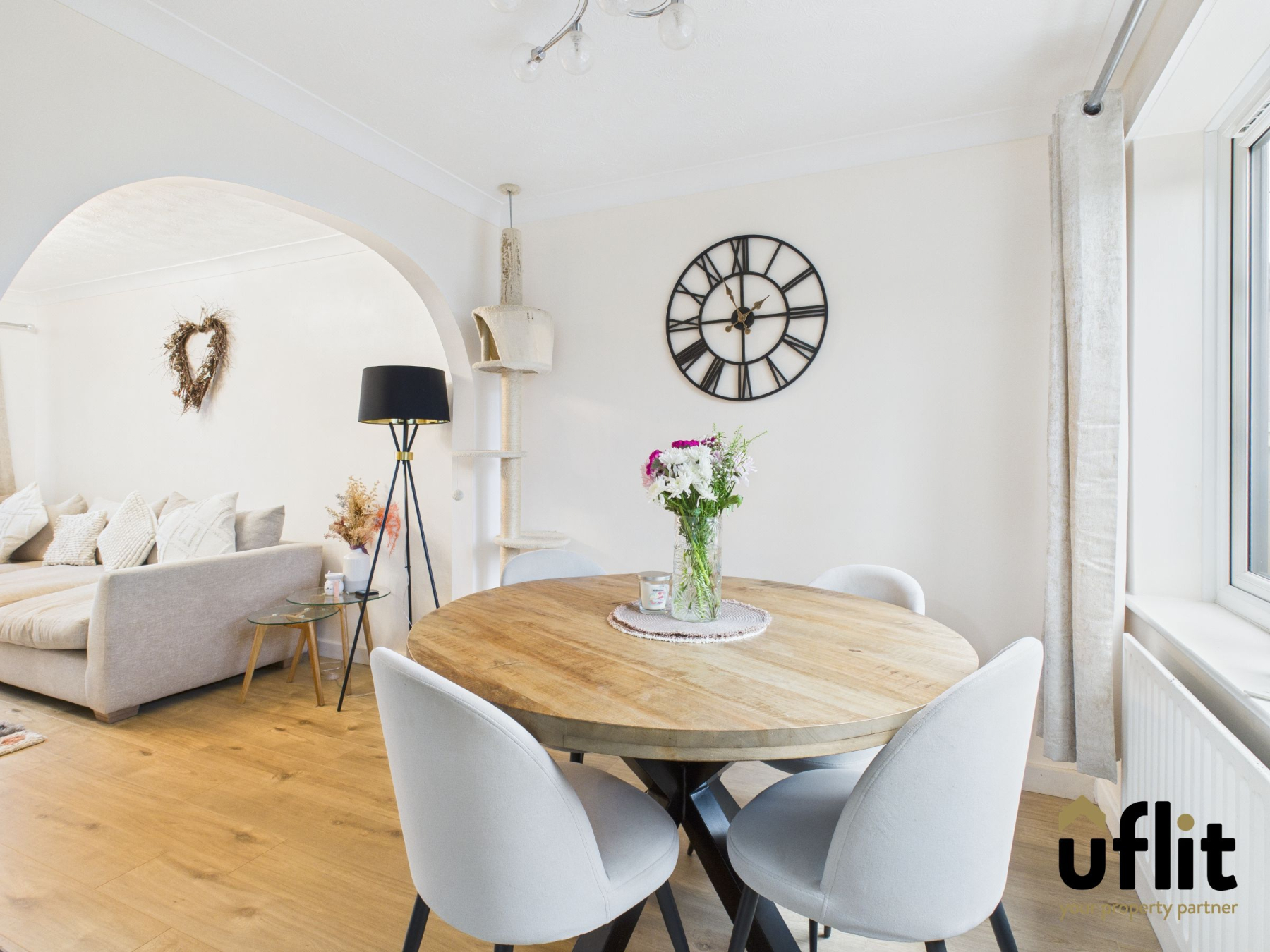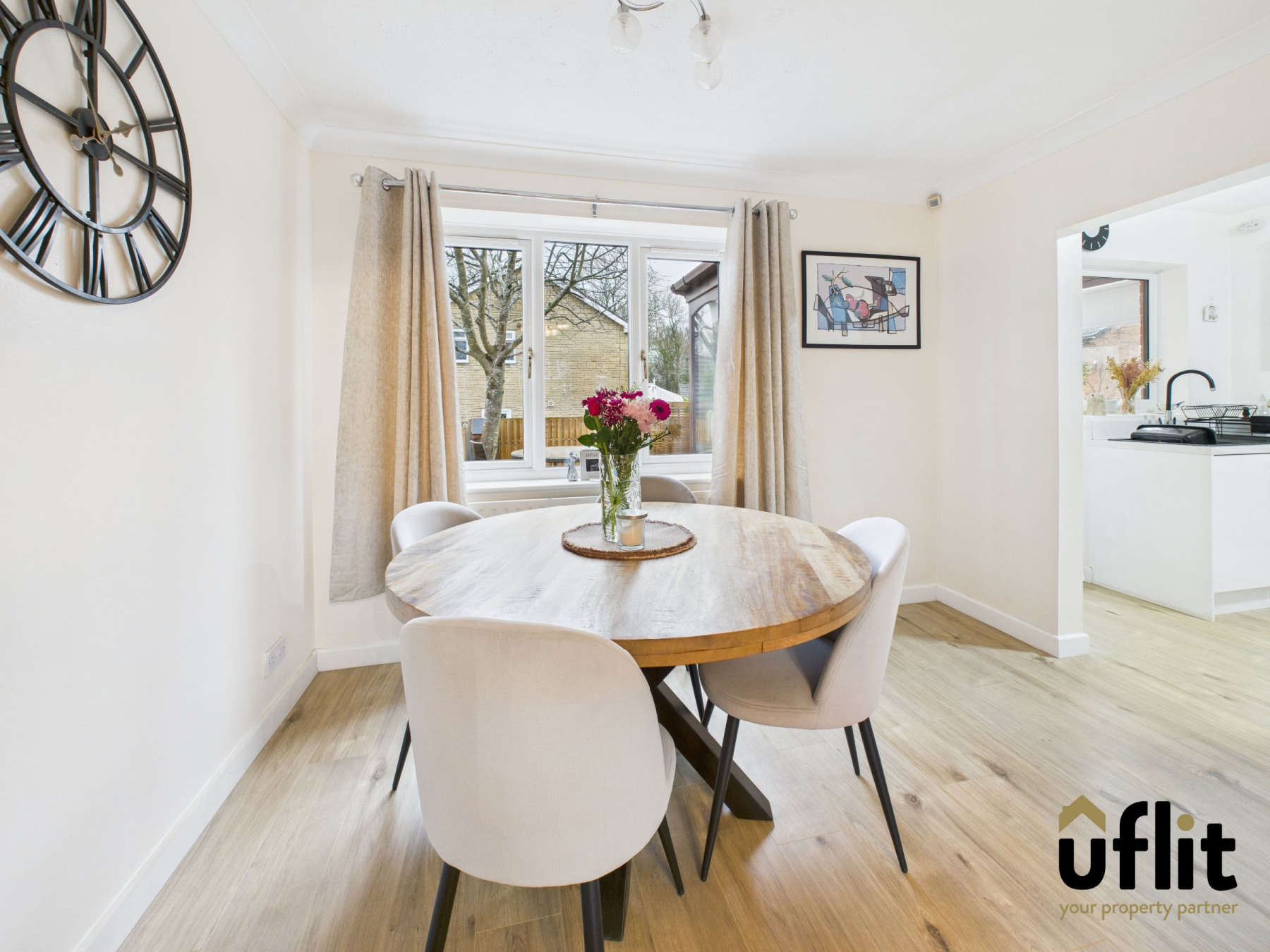 Accessed via an archway from the lounge, the dining room benefits from laminate flooring and a rear-facing window, making it ideal for family meals and entertaining.