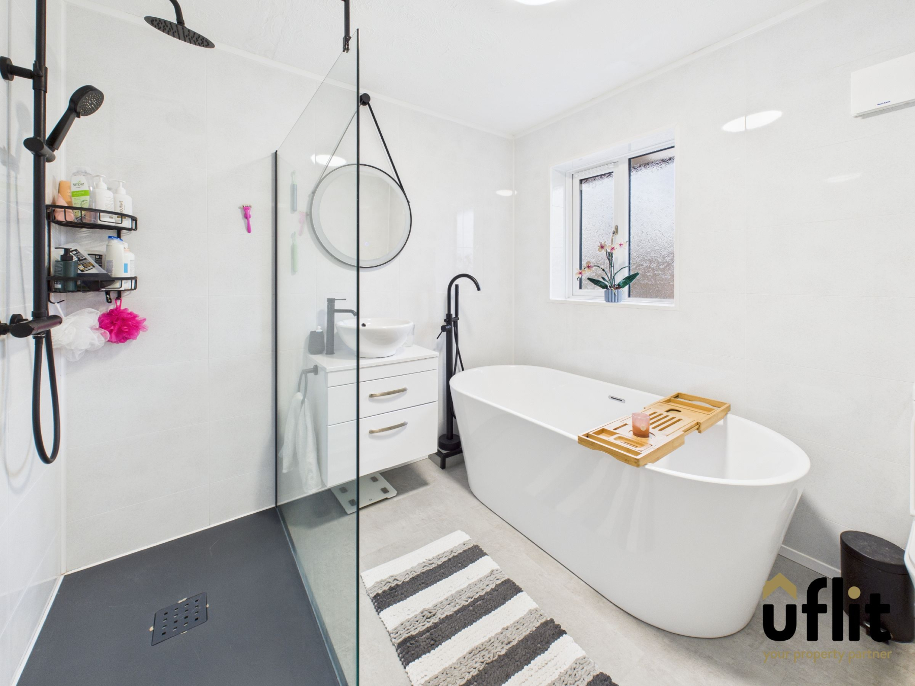 A stylishly finished bathroom comprising laminate flooring, walk-in dual-head shower, freestanding bath with black taps, wash basin with storage cupboard, low-level WC, towel radiator and full panelling. A rear-facing window provides natural light.