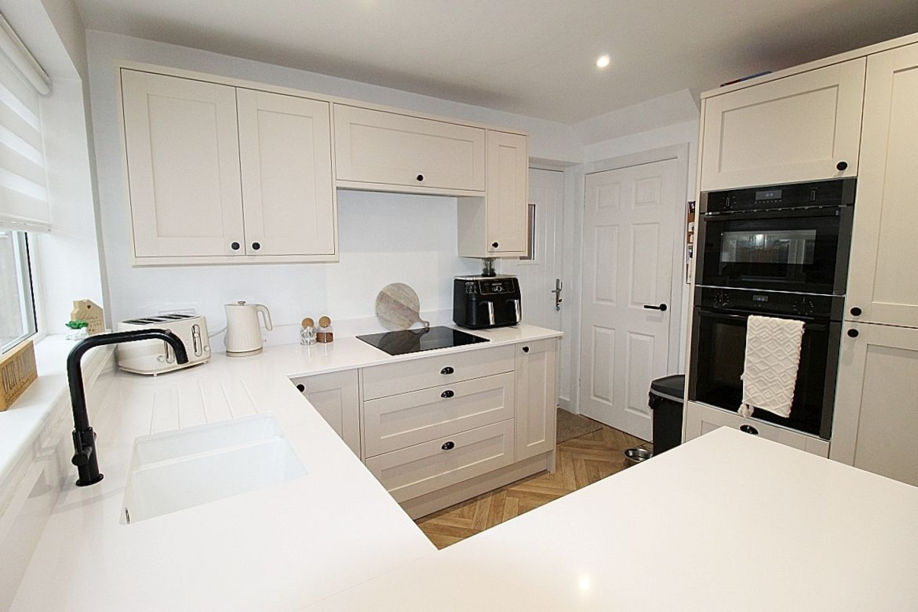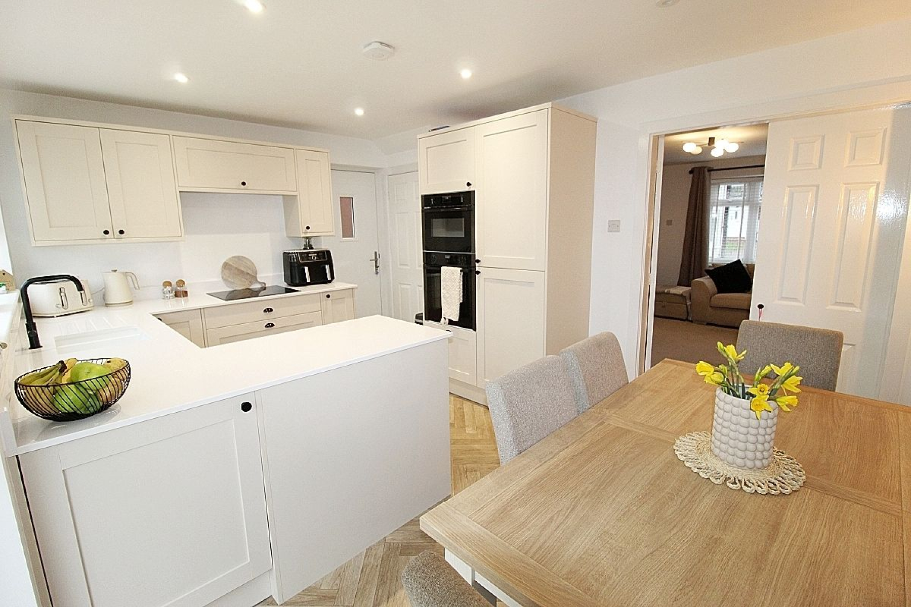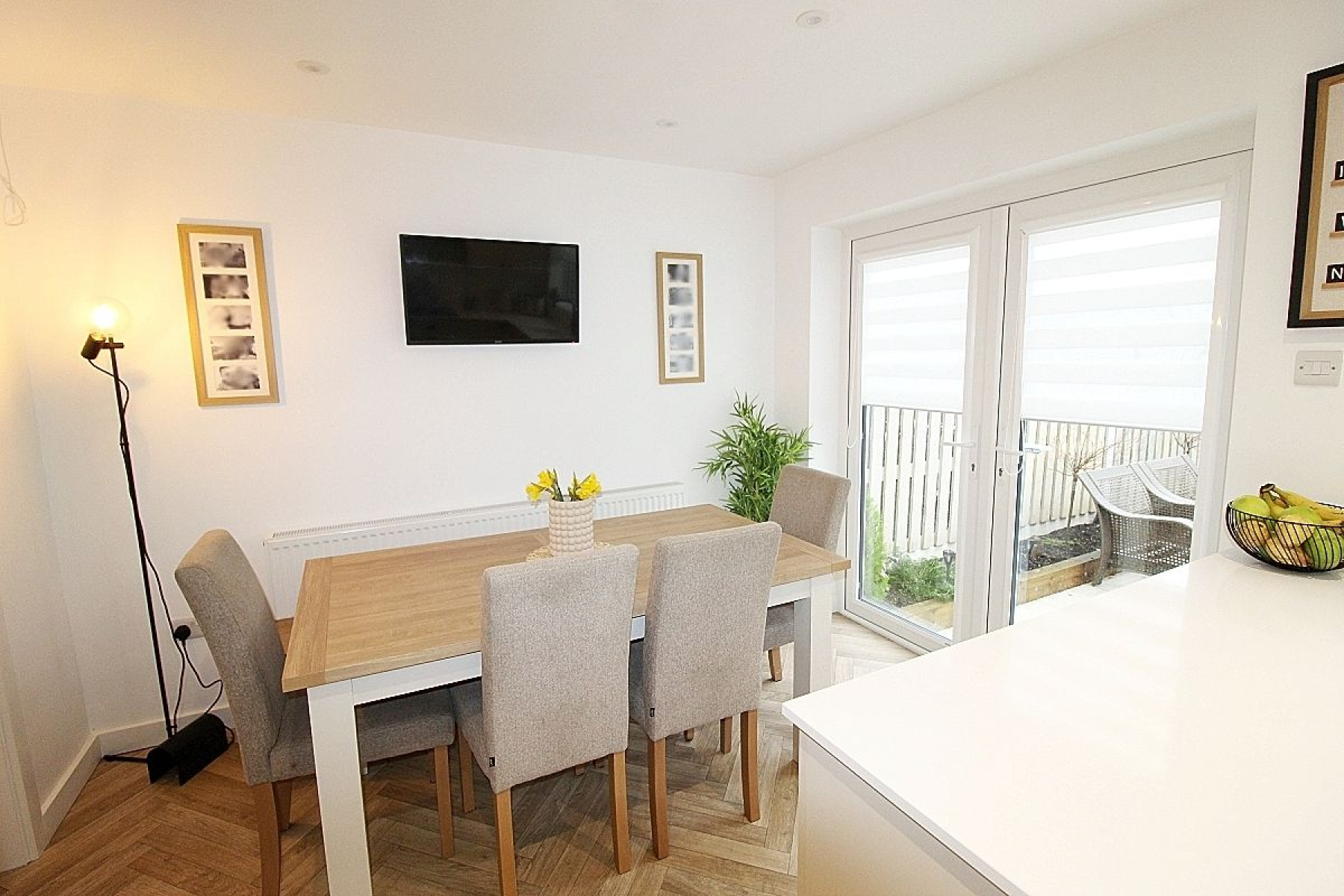 The hub and heart of this family home with a stunning modern newly fitted kitchen with a range of fitted wall and base units, complimentary granite work surface areas with an under counter composite sink and designer tap, a fabulous adjoining breakfast bar compliments. Fully integrated appliances to include an eye level built-in oven with complimentary microwave, induction hob, extractor fan and integrated dishwasher and washing machine adopting further wrap around units. A rear facing UPVC window and French doors with glazed side panels open onto the rear garden illuminating this space whilst spot and under counter lighting creates the mood. Radiator, luxury flooring flows throughout, a glazed composite door opens to the rear and a further door to under stairs storage.