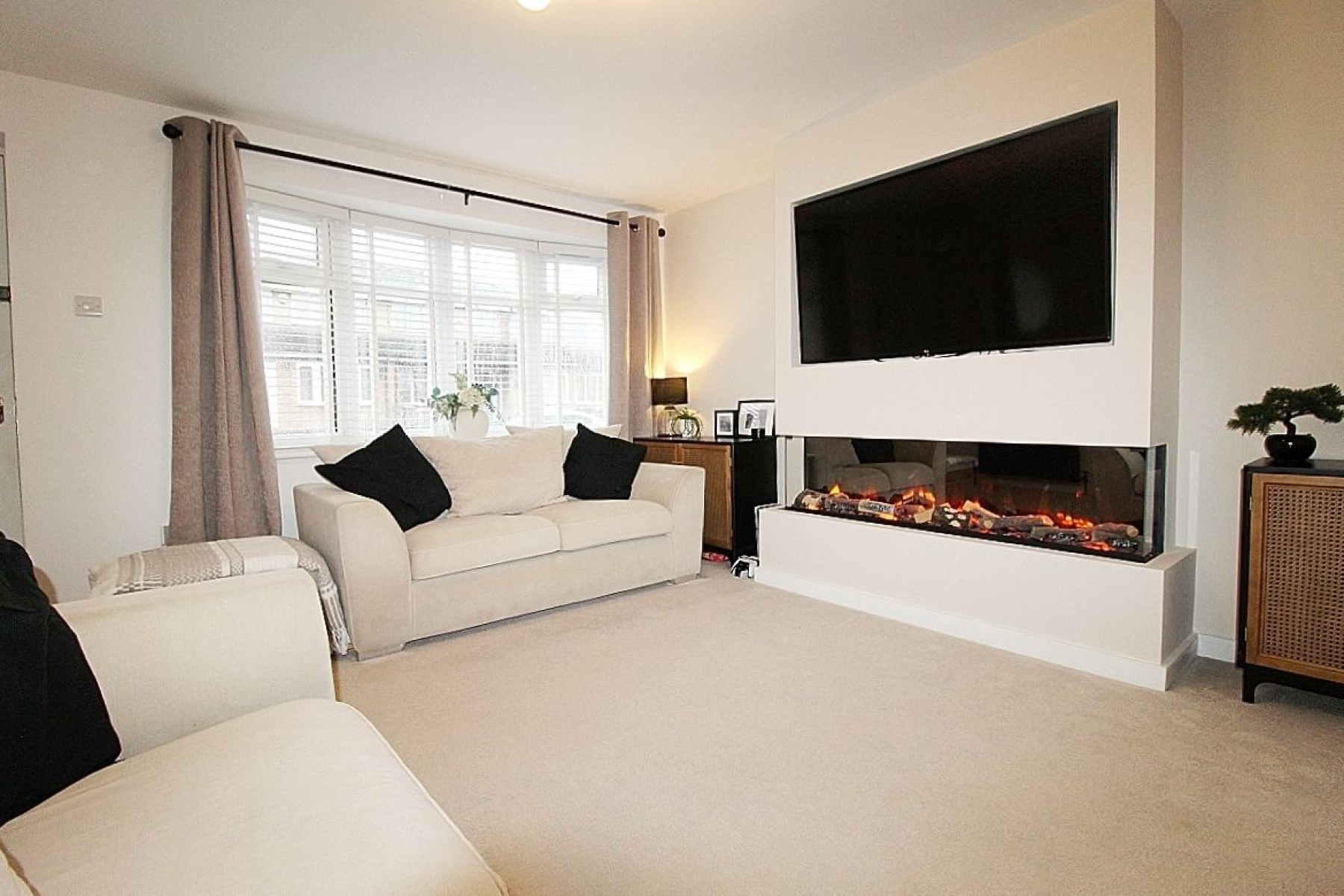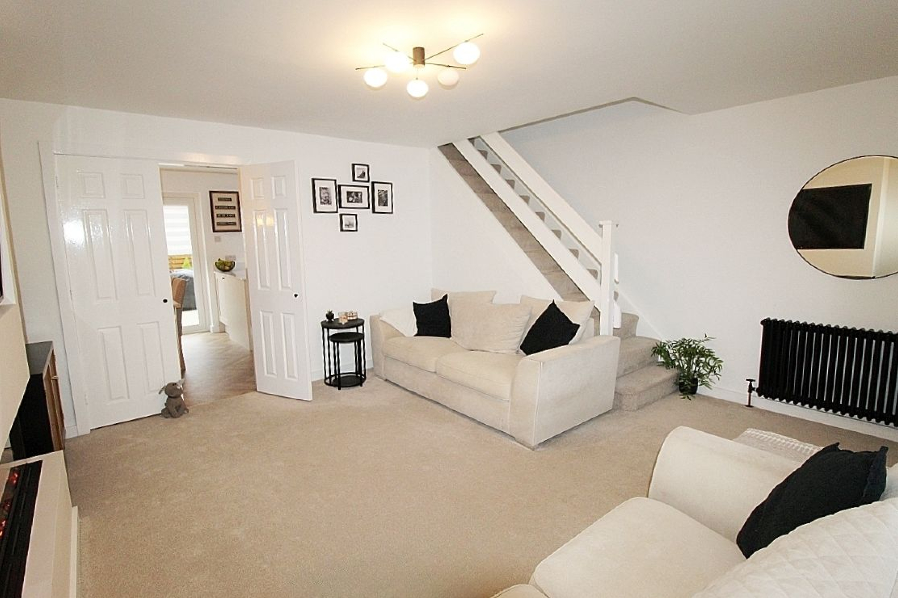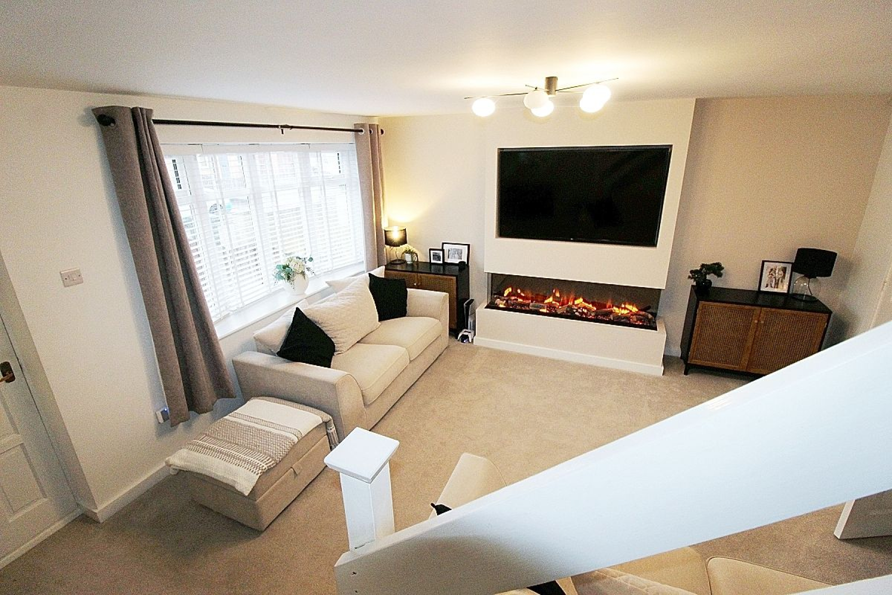 A stunning spacious living area with a bespoke focal feature media wall adopting the fire and tv, a front facing UPVC bay window allows an abundance of light to flow through and a radiator adds warmth. Carpeted flooring leads to stairs to the first floor accommodation, designer radiator and french doors giving access to the kitchen/ diner.