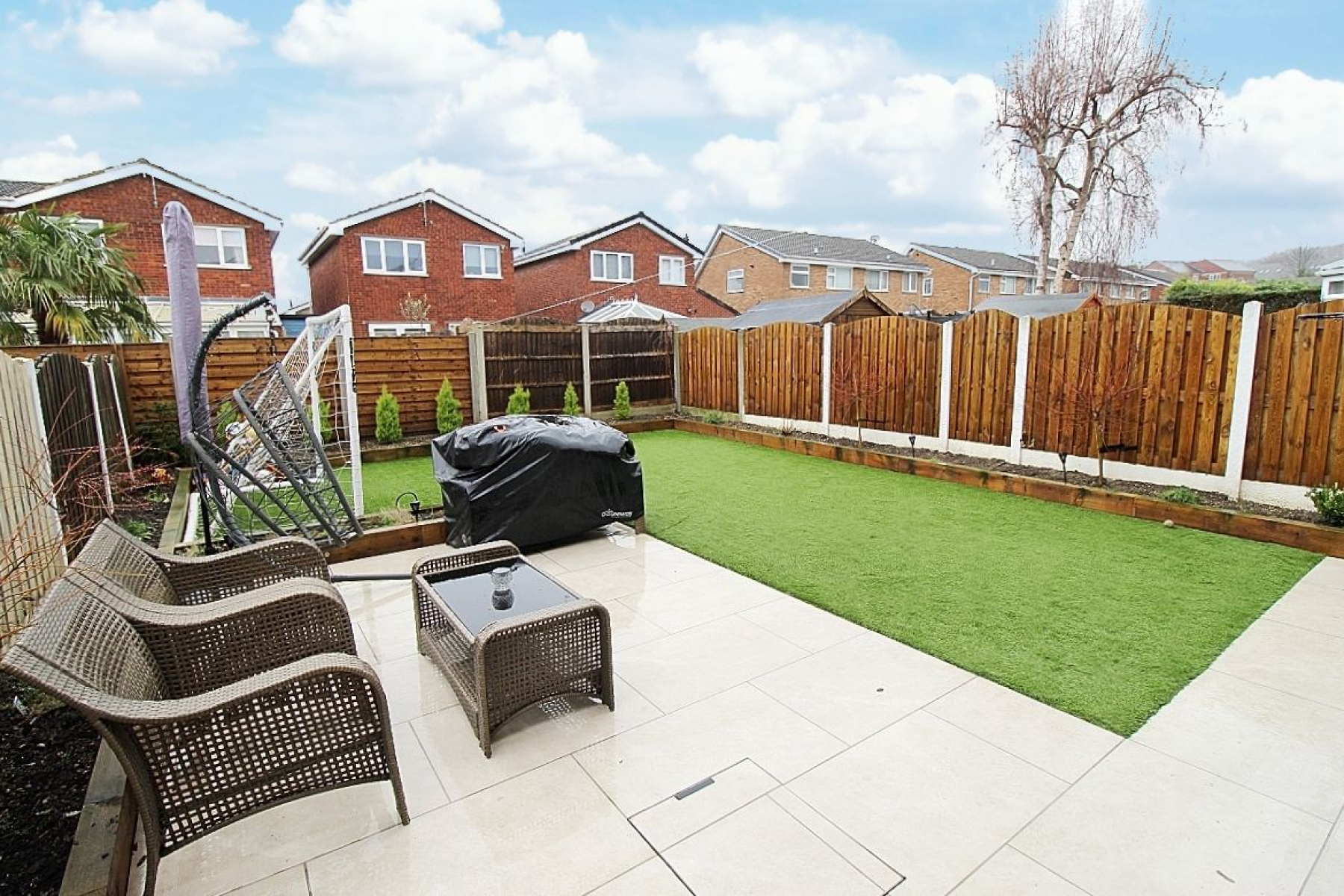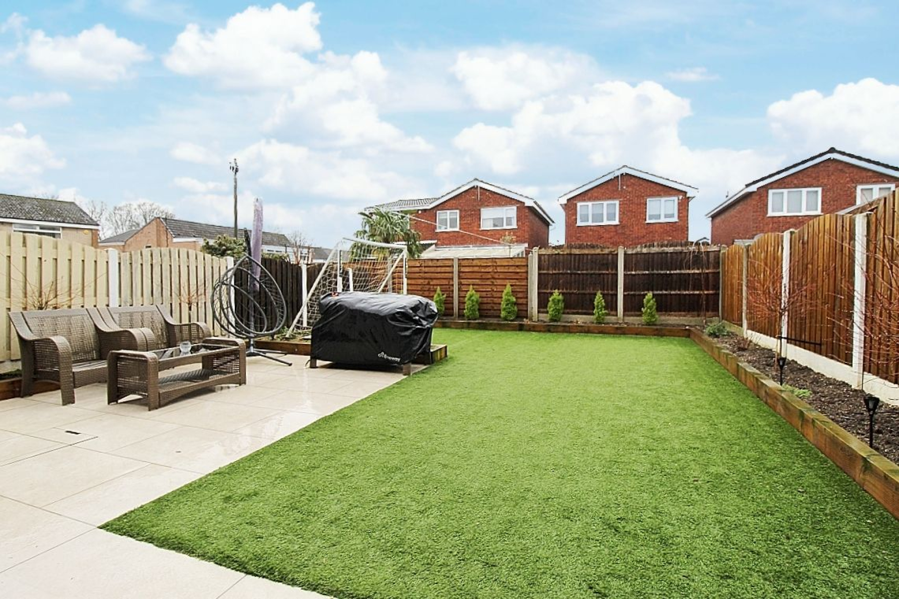 An attractive open aspect frontage with a decorative slate driveway providing ample off road parking. Side gated access to the rear garden where a beautiful porcelain patio leads to a low maintenance Astro turf garden with attractive raised sleeper borders all enclosed by fencing creating a stunning entertaining area.