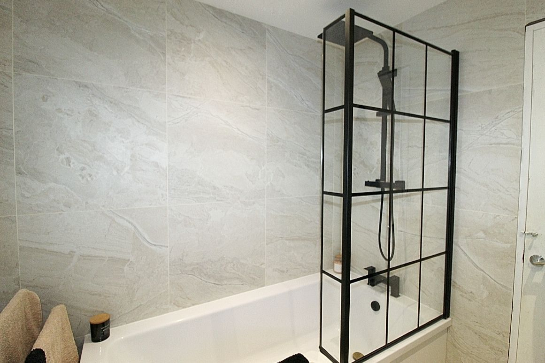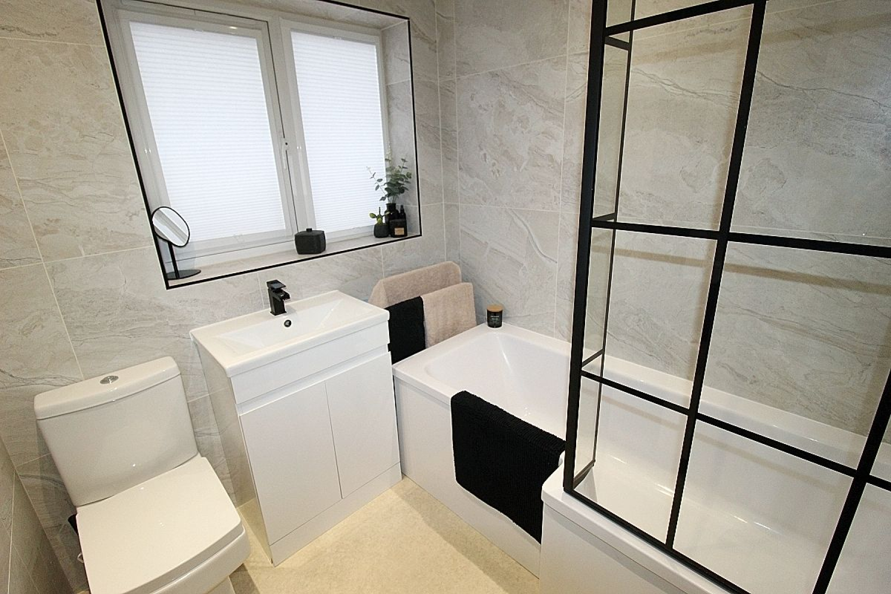 A stunning family bathroom comprising of a p-shaped panelled bath with overhead double shower and screen, a vanity unit housing the wash hand basin and a WC. Beautiful tiled walls with complimentary flooring, spot lighting, designer heated towel rail and rear facing UPVC window.