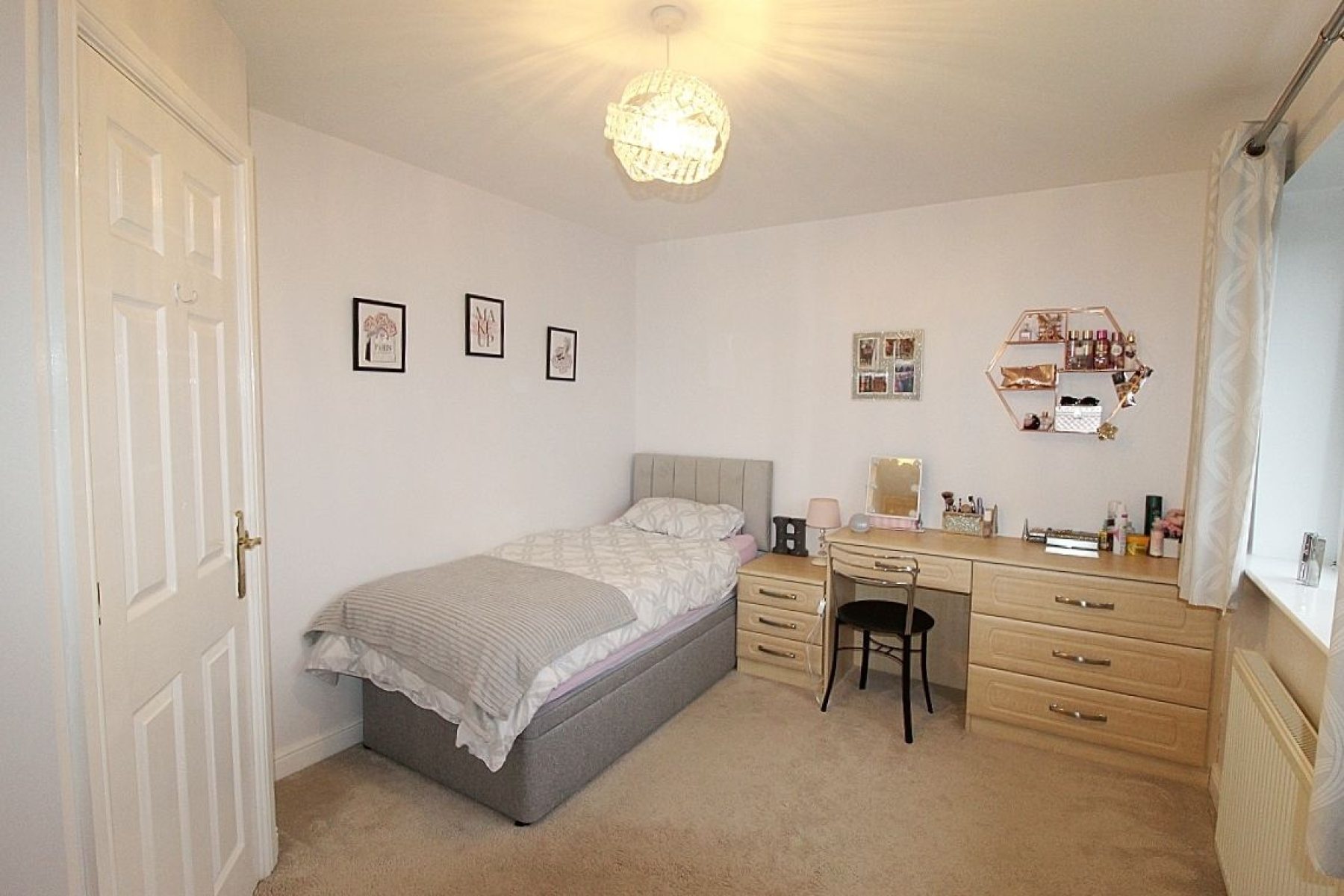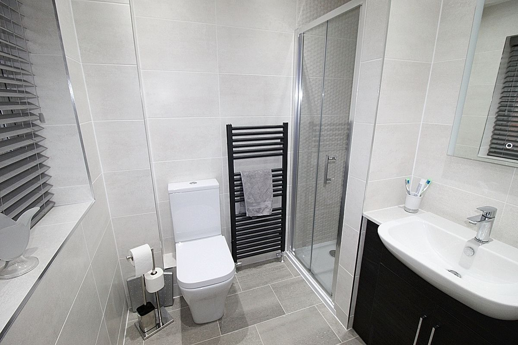 A beautifully appointed ensuite fully tiled with feature tiles to the shower area. Comprising of a low level wc, vanity wash hand basin and a built in shower. Heated towel rail, spot lighting and a front facing upvc window.