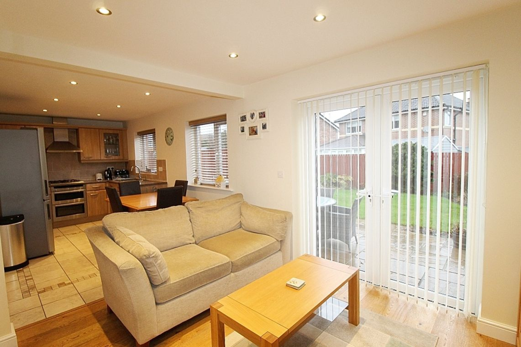 A fabulous open plan family entertainment space and the heart and hub of this family home featuring a modern kitchen comprising of a range of wall and base units with complimentary work surface areas counter top sink, double oven, gas hob with extractor fan and an integrated dishwasher. Beautiful tiled flooring splits to solid wood flooring to the dining area giving a sense of separation whilst retaining the open plan aspect. The whole area is illuminated with spot lighting along with two rear facing upvc windows and French doors opening onto the garden whilst two radiators add warmth. Doors give access to the utility area and storage cupboard.