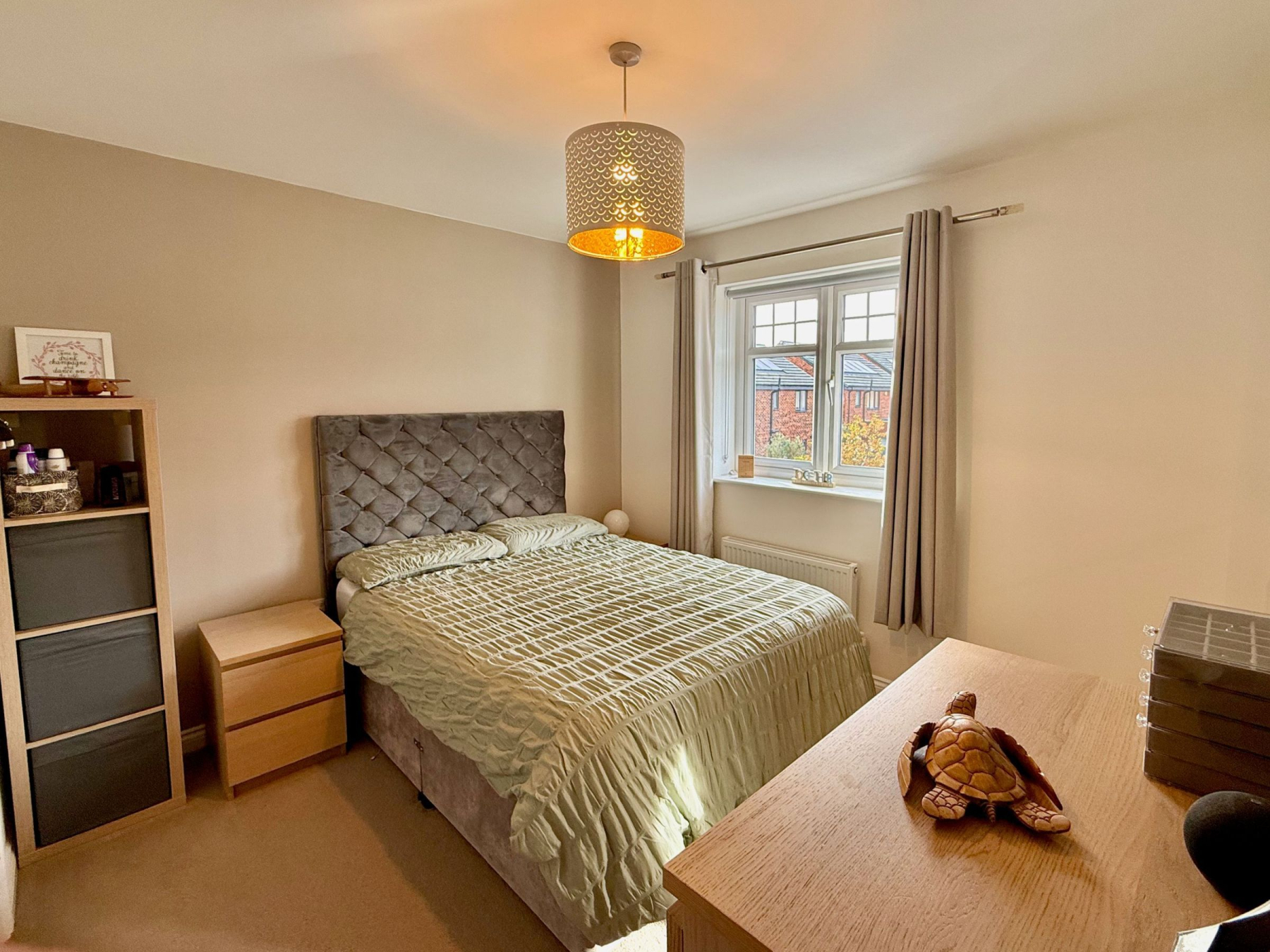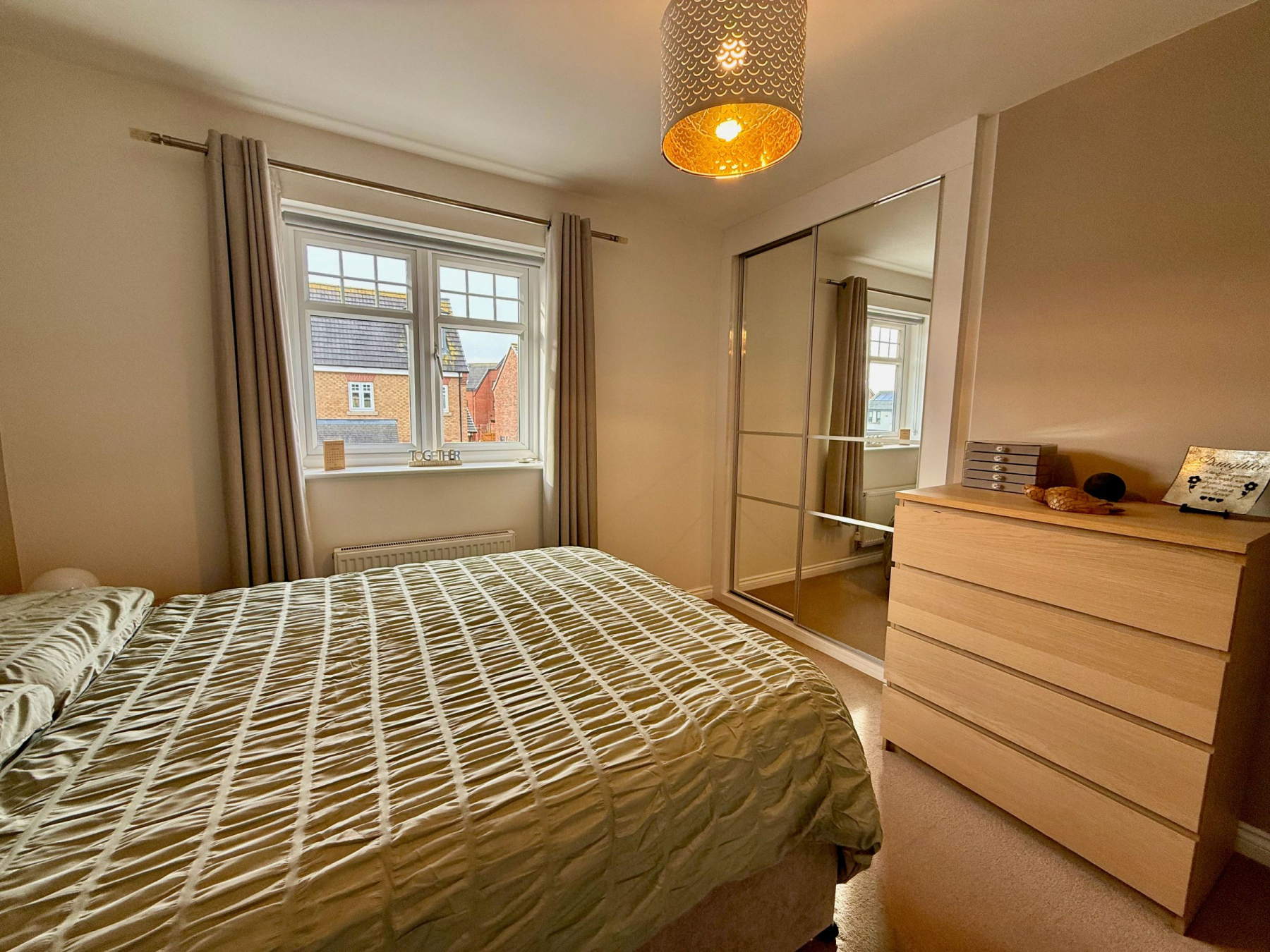 Situated to the rear of the property, bedroom three enjoys views over the garden. It features carpeted flooring, a radiator and a double fitted wardrobe, making it a comfortable and versatile space suitable for a bedroom, nursery or home office.