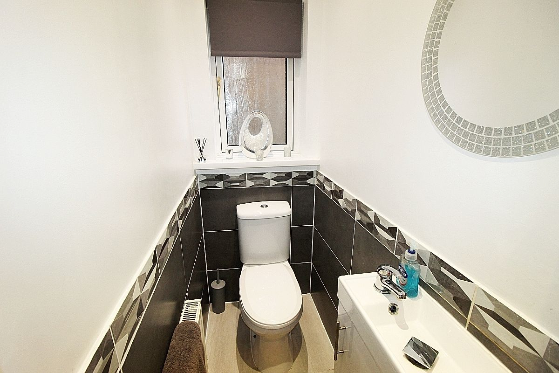 A beautifully presented cloakroom with a low level wc, vanity wash hand basin, partially tiled walls with contrasting floor tiles, radiator and a side facing upvc window.