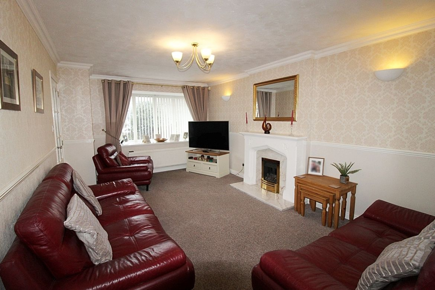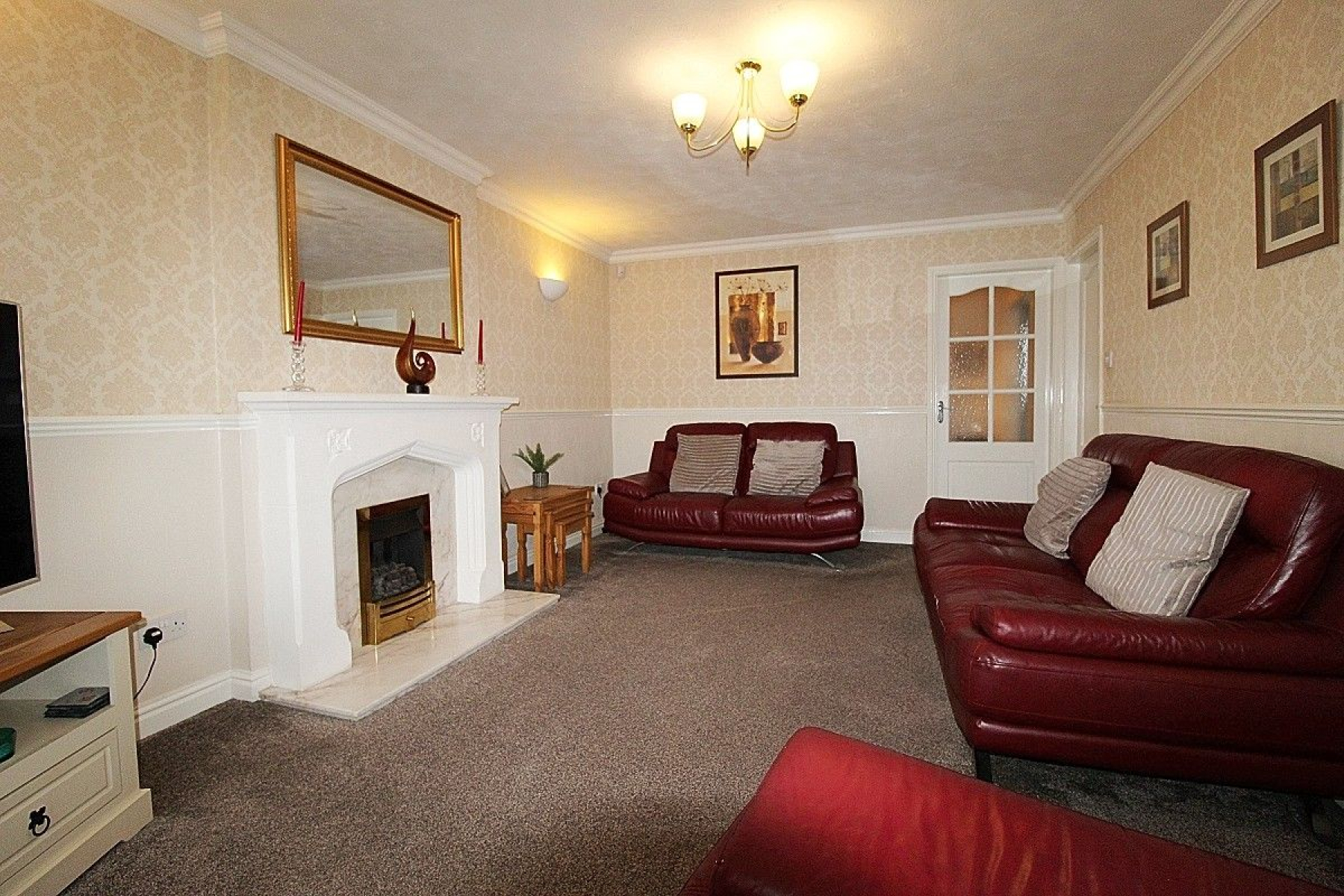 A spacious and modern living area boasting a front facing upvc bay window allowing the light to flow through this entire space, carpeted flooring, radiator and a beautiful fire place with marble facade creates a feature. A glazed panelled door leads to the open plan breakfast kitchen diner and a further door to the inner hallway.