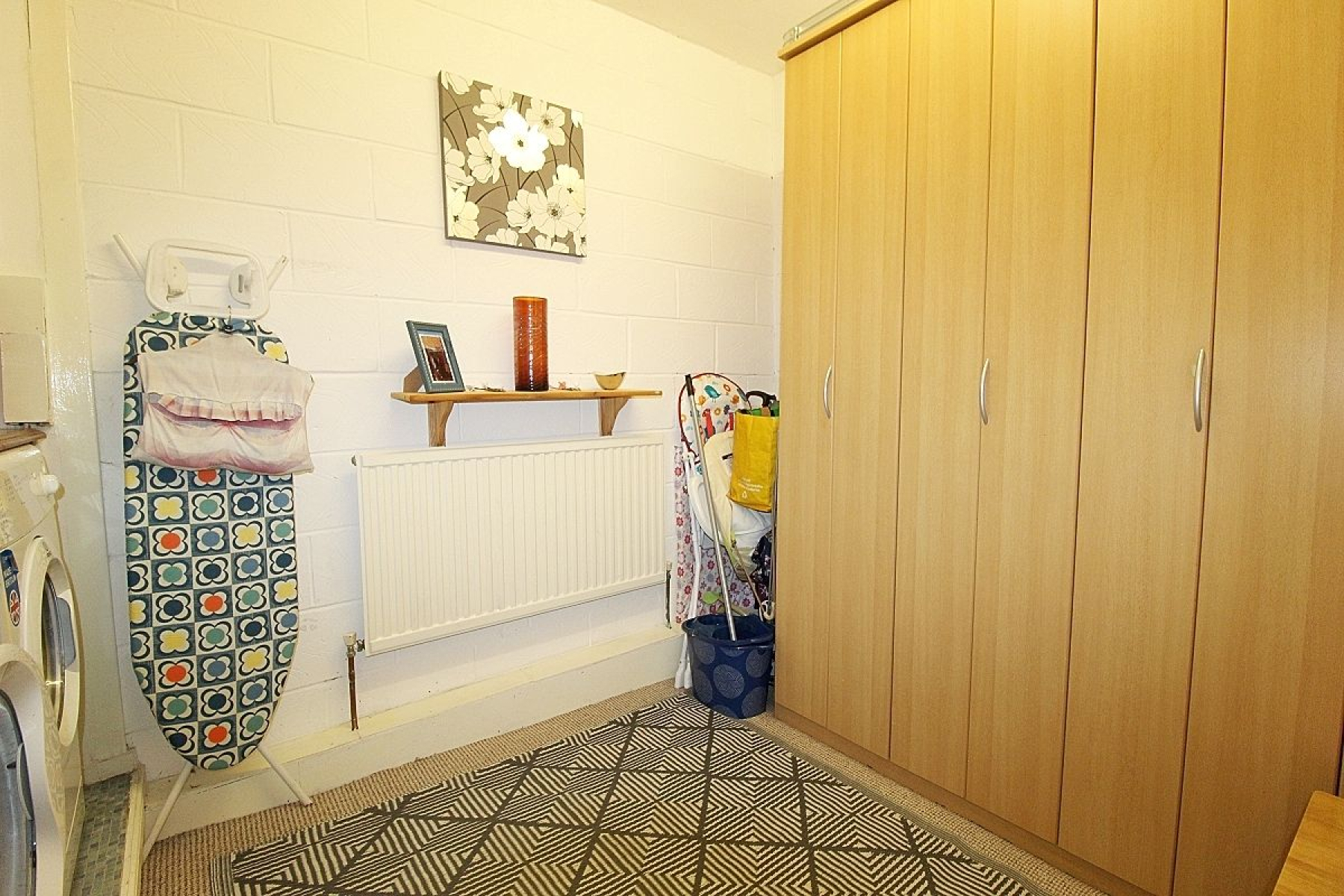 Adopting the rear of the garage is this spacious utility area with a large range of fitted storage, work surface areas, plumbing for further utilities, carpeted flooring and a radiator.