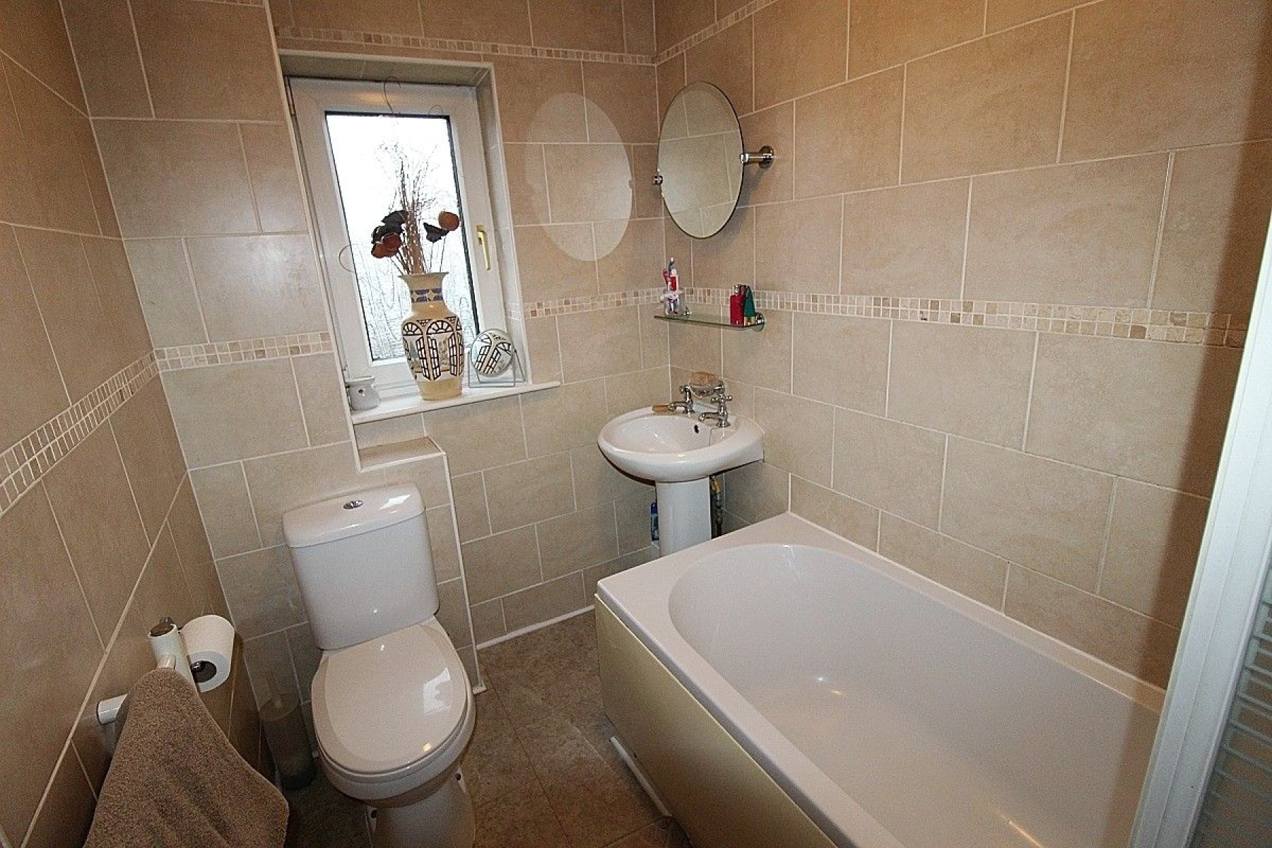 A modern family bathroom comprising of a panelled bath with overhead shower and screen, wash hand basin and a low level wc. Fully tiled walls with contrasting flooring, rear facing upvc window paneled ceiling and a heated towel rail.