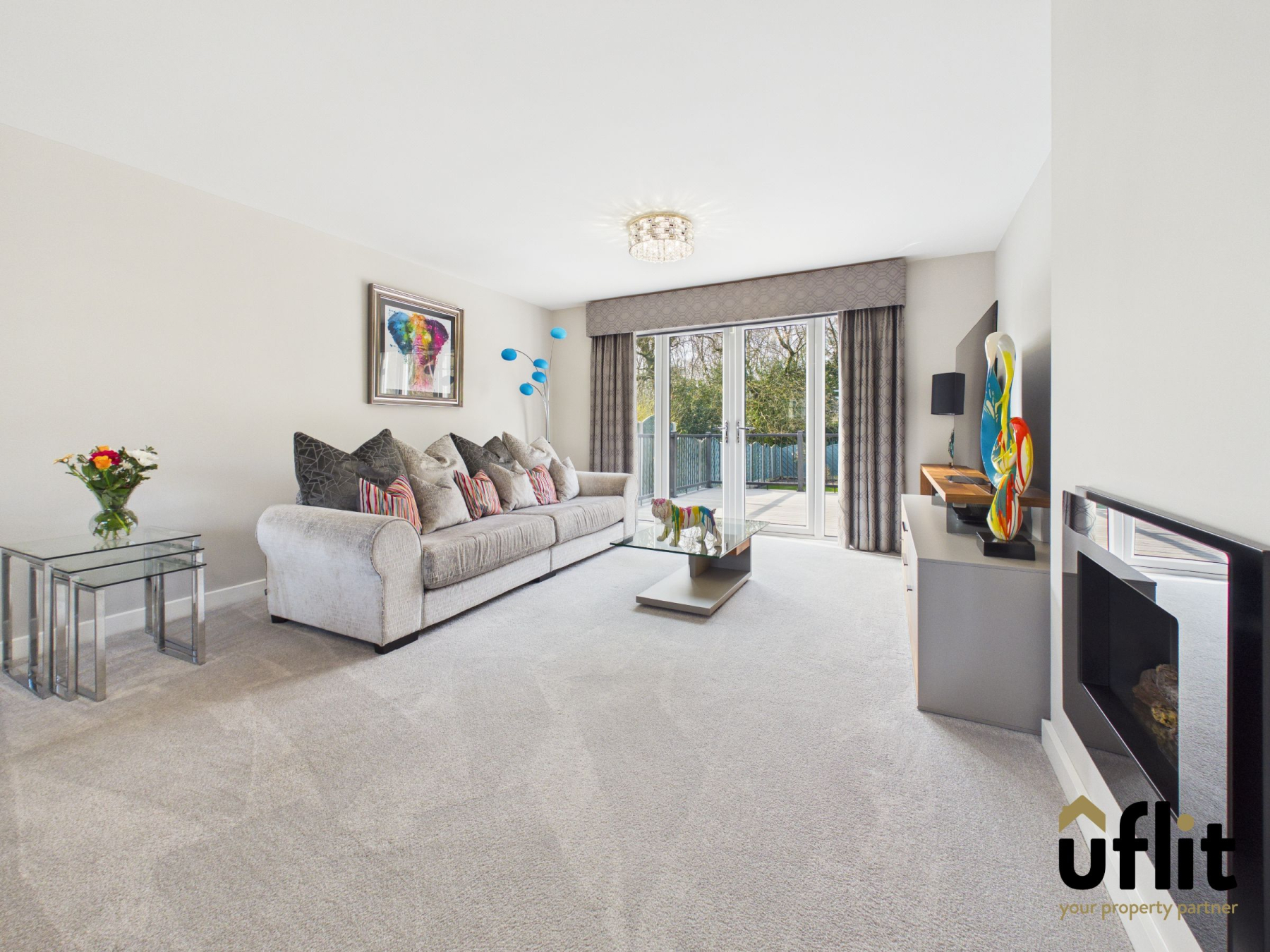 The elegant living room provides a sophisticated yet welcoming space, enhanced by a striking bay window and stylish fireplace. French doors open directly onto the rear composite decking, creating seamless indoor and outdoor living.