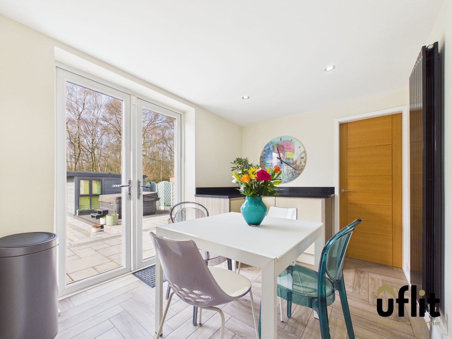 A superb formal dining room ideal for entertaining guests or hosting family occasions. The room enjoys generous proportions and a bright, airy feel, enhanced by French doors that open onto the rear decking area, creating an effortless flow to the outdoor entertaining space during warmer months.