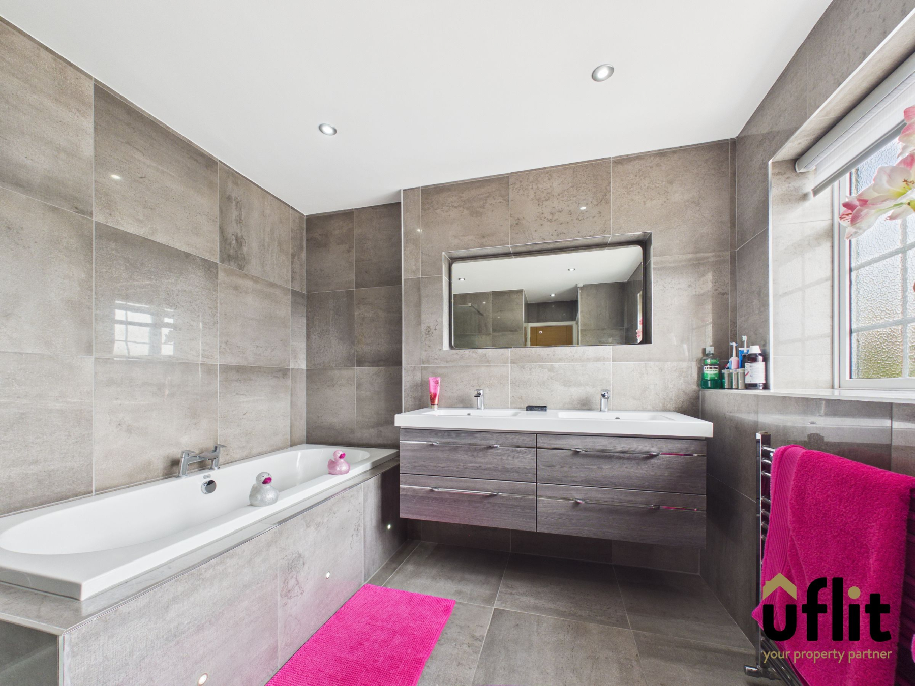 A luxurious family bathroom serving the additional bedrooms, finished with quality fixtures and fittings to create a relaxing and stylish space for everyday family use.