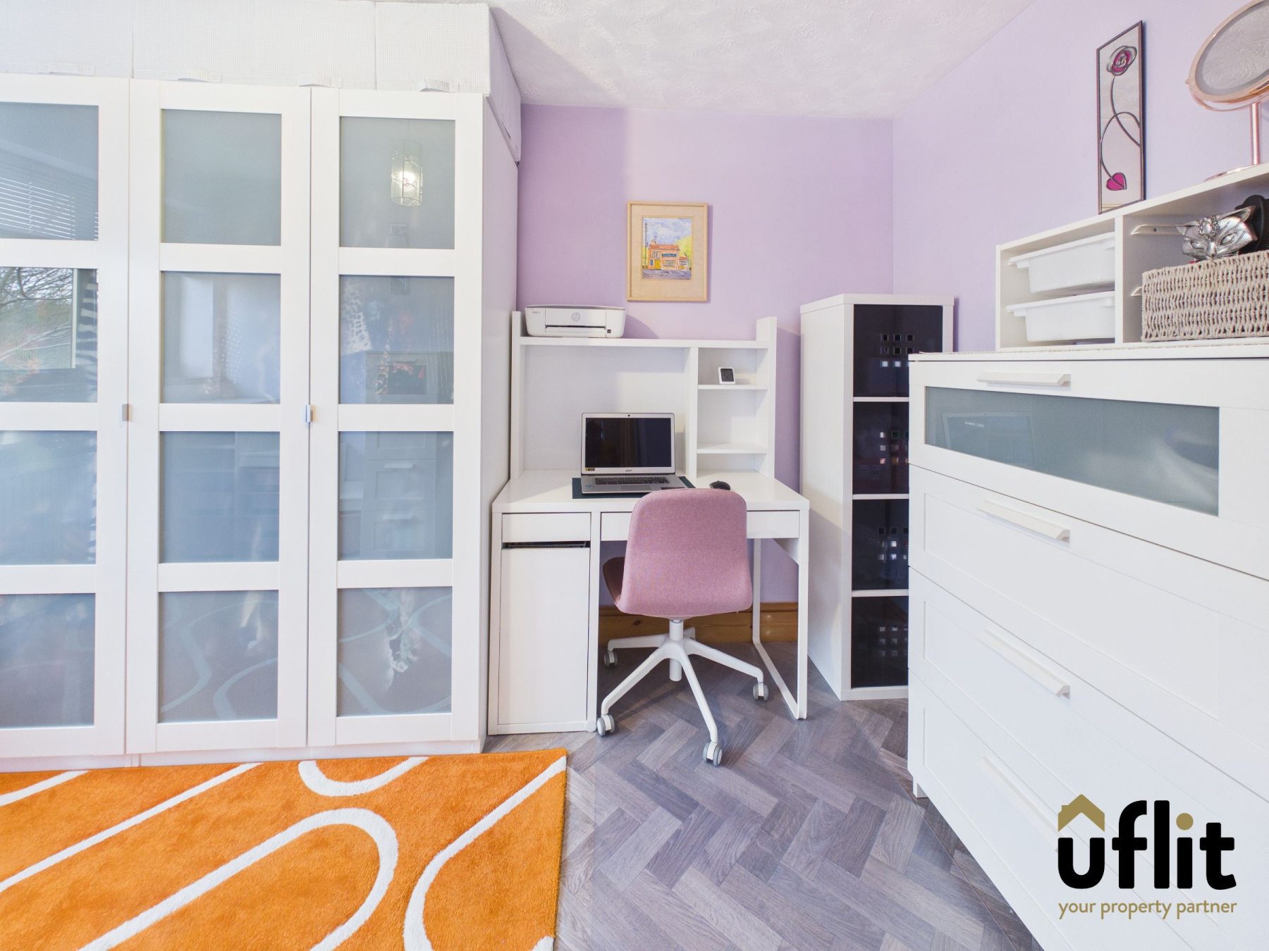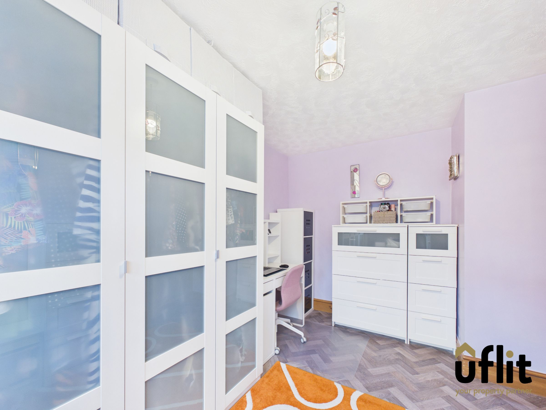The master bedroom is located at the front of the property and benefits from an excellent range of fitted wardrobes with three doors, four drawers and overhead storage, along with an additional fitted storage cupboard, providing ample built-in storage. Bedroom two is positioned to the rear of the property and offers a comfortable and well-proportioned space overlooking the garden, while bedroom three is located to the front and would make an ideal bedroom, nursery or home office.