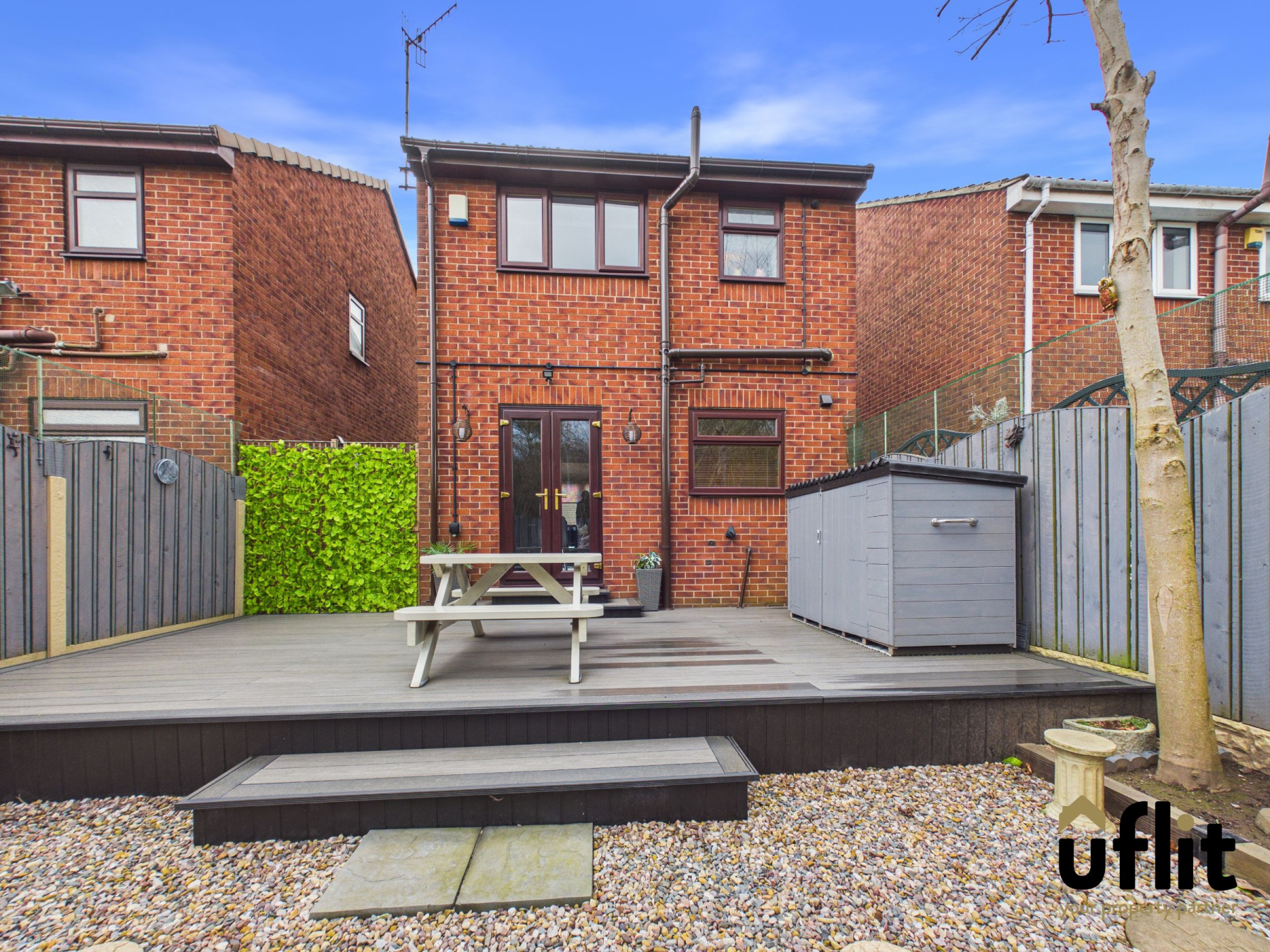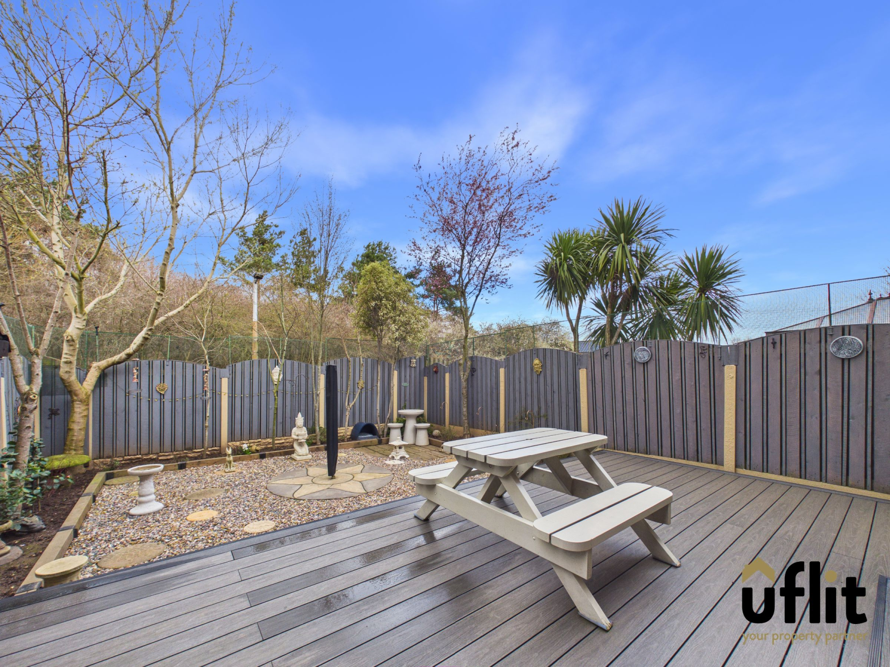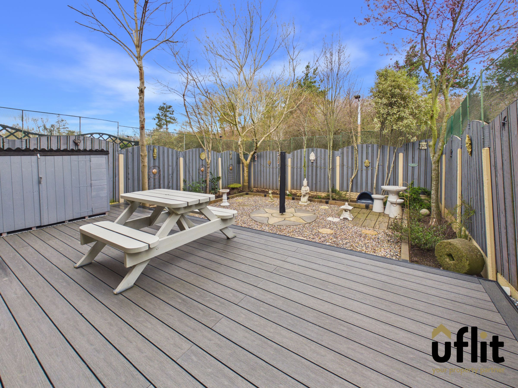To the rear is a low-maintenance enclosed garden designed for easy upkeep and outdoor enjoyment. The space features composite decking and pebbled landscaping, with railway sleeper borders providing areas for shrubbery and planting, creating an attractive and private outdoor setting.