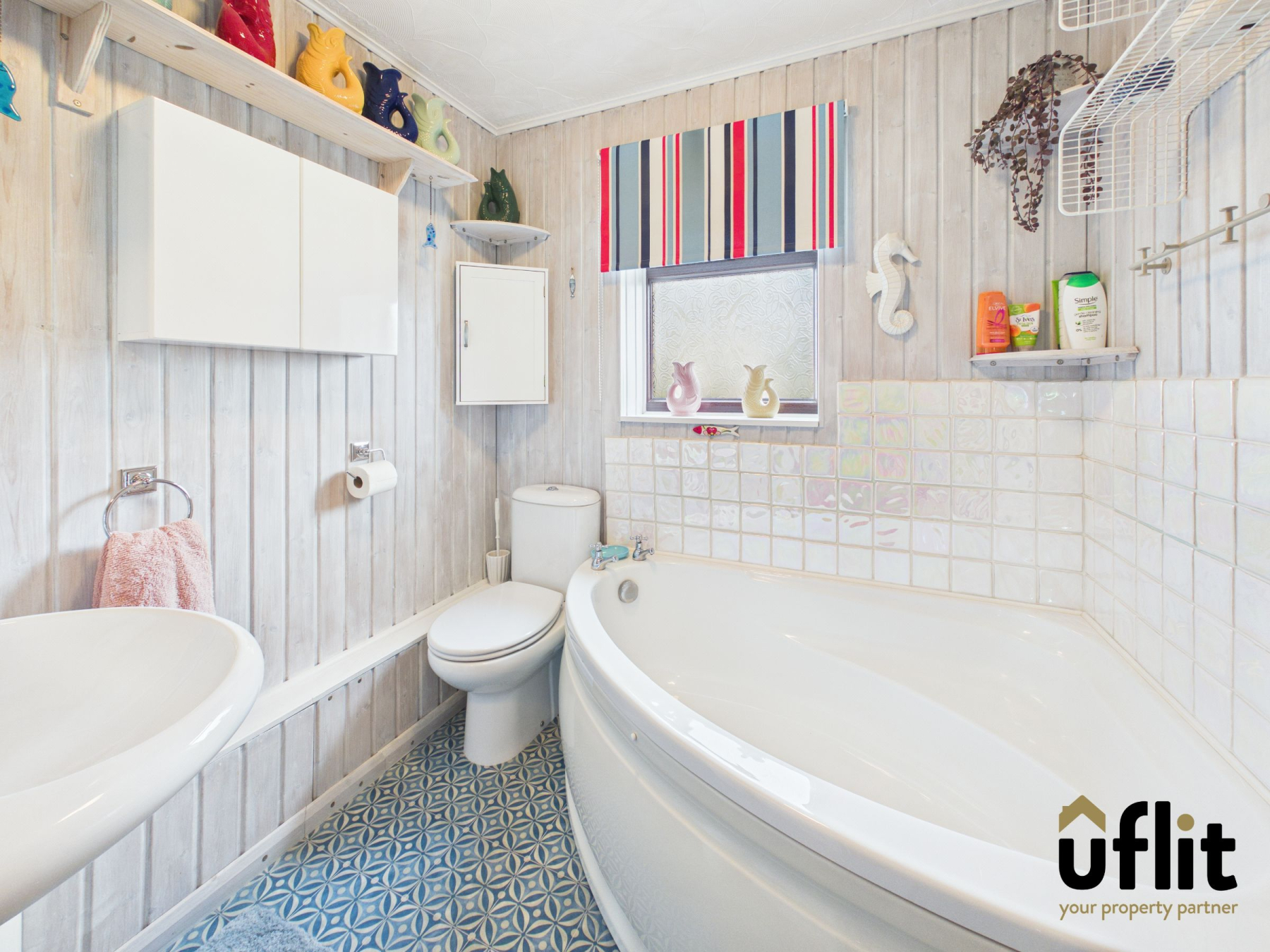 The family bathroom is fitted with a corner bath unit, wash basin and low-level WC. The room is partially tiled and complemented by attractive tongue and groove panelling. A window to the rear provides natural light and ventilation. Finished with wood-effect lino flooring and a towel radiator.