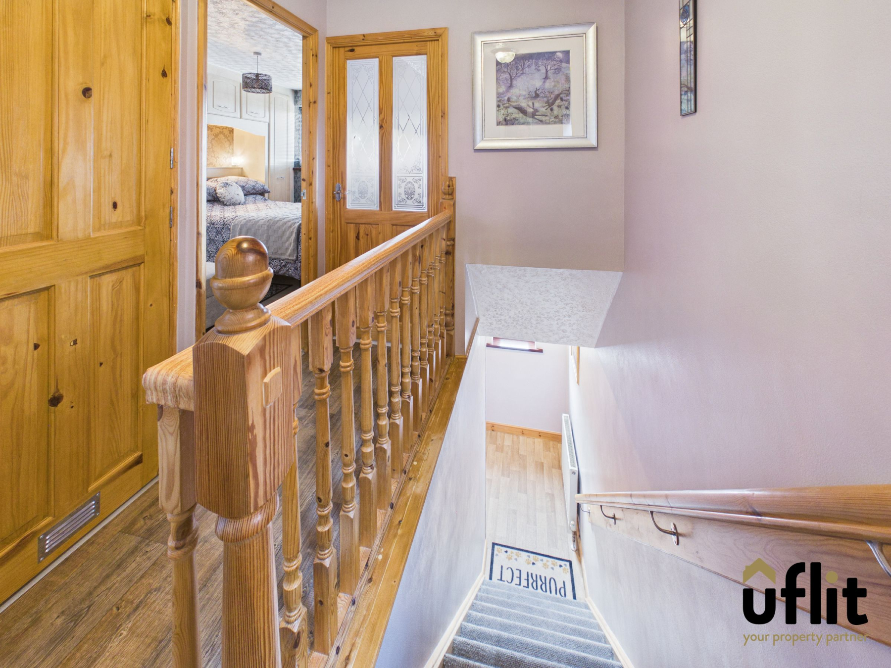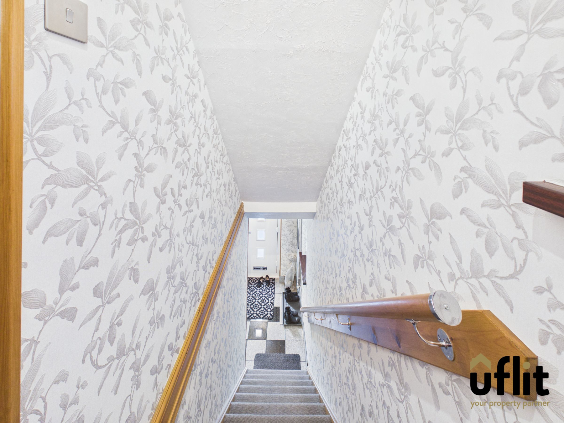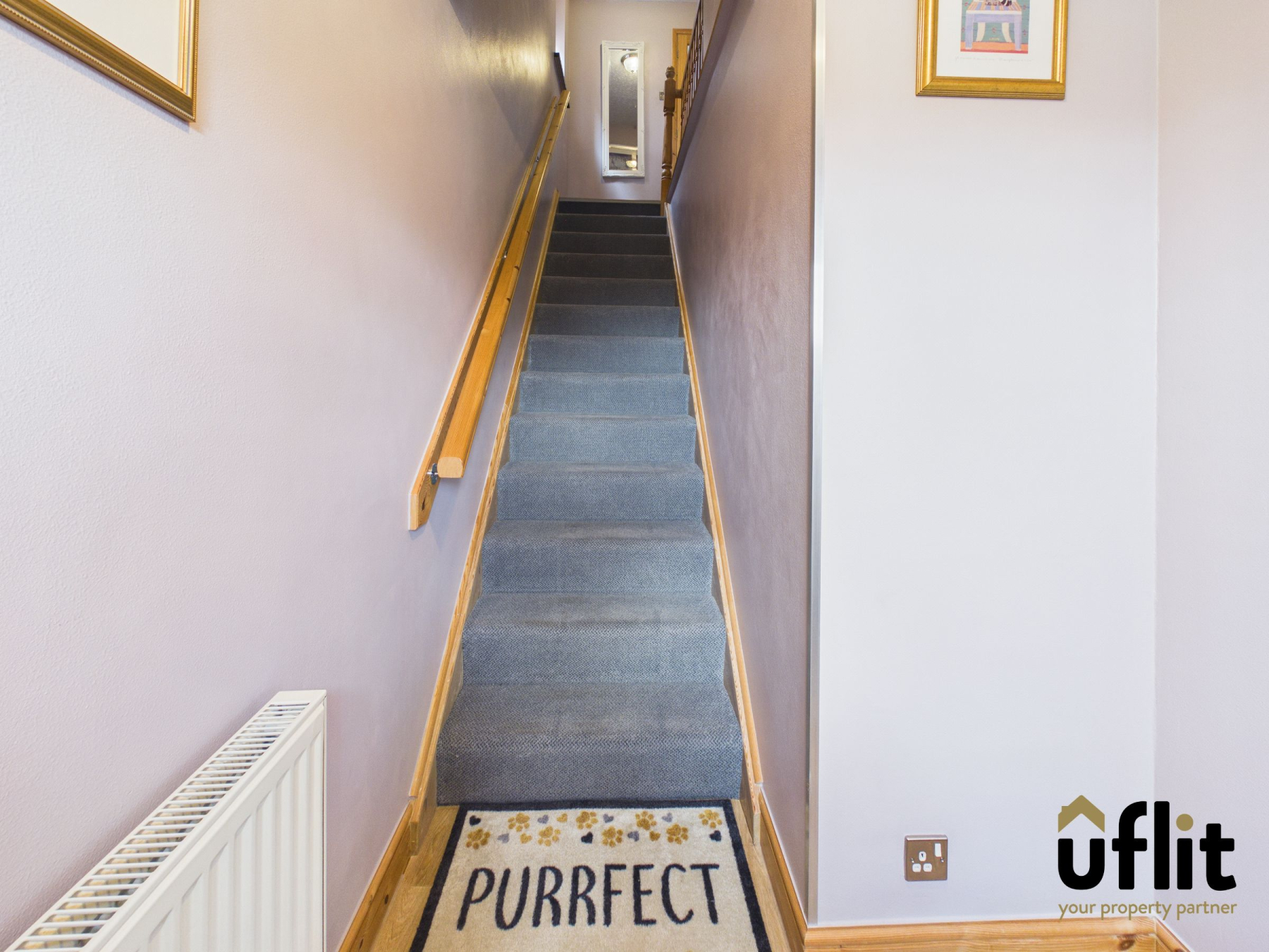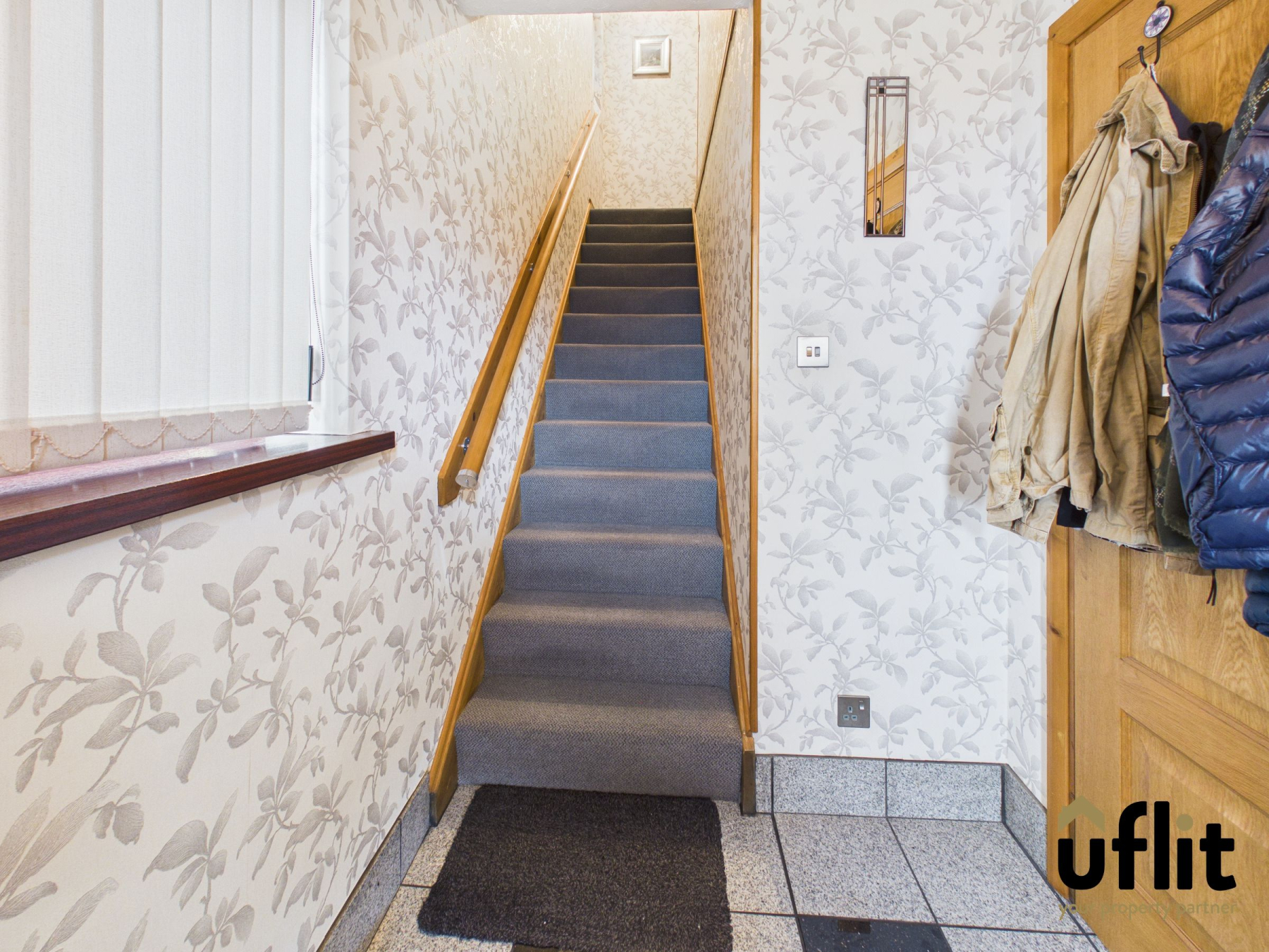 Carpeted stairs lead to the first-floor landing, with a window to the side allowing light to flow through the stairwell. The landing provides access to the main living accommodation.